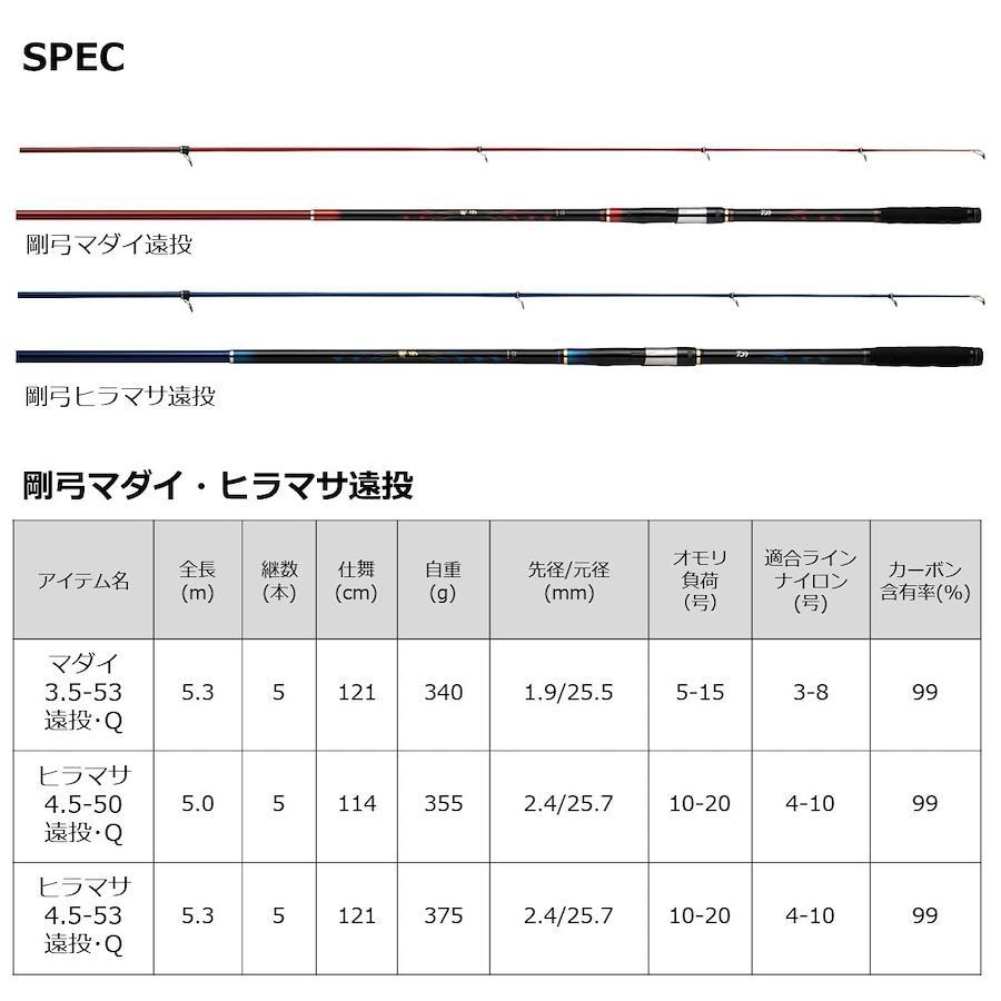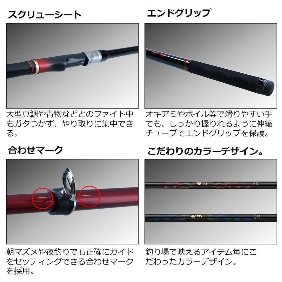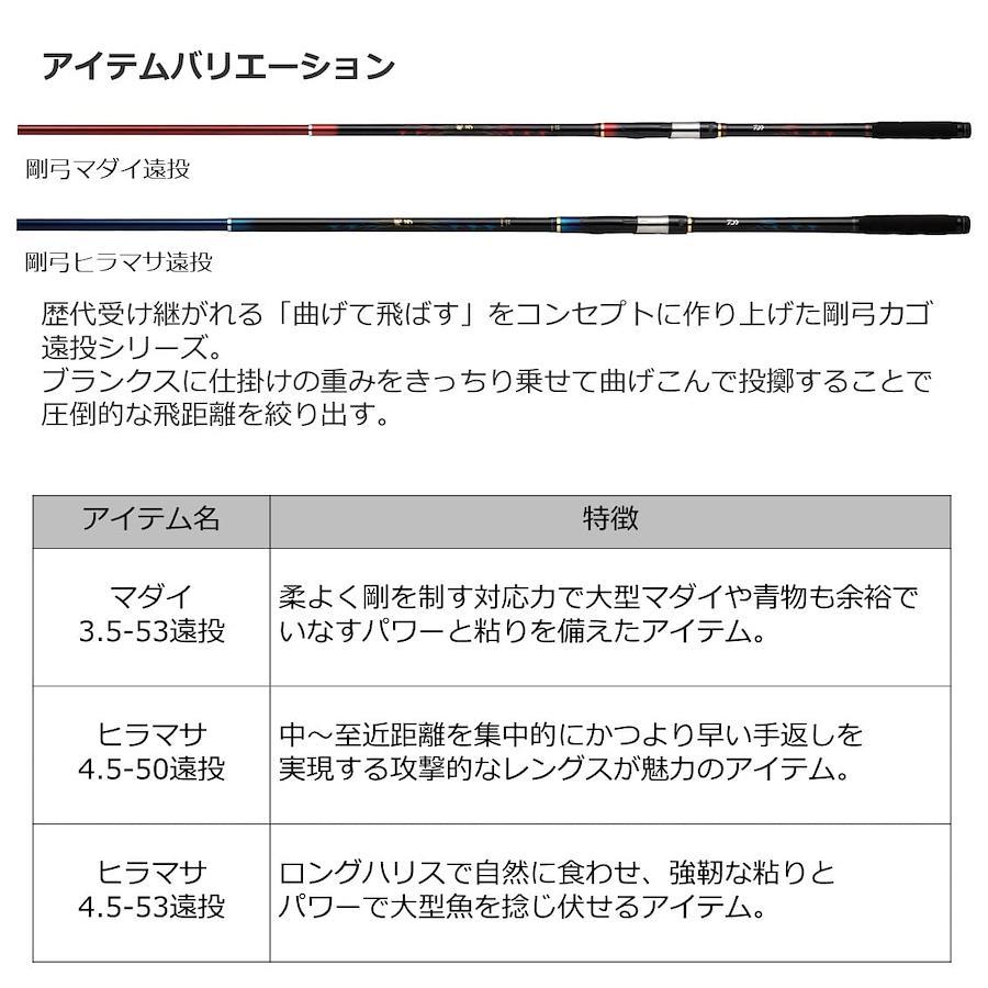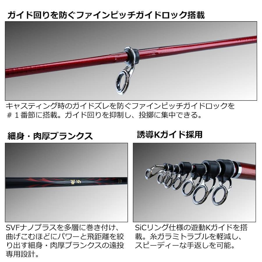 剛弓」シリーズは歴代受け継がれる弓の如くしなる細身・肉厚ブランクスにより、飛距離とパワーを絞り出す遠投専用設計。竿の反発力を最大限発揮させ、オーバーキャストが出来ない狭い磯場やサイドスロー的スナップ投法で胴に乗せて遠投する日本海山陰のタルカゴ仕掛けが主流のエリアに最適。