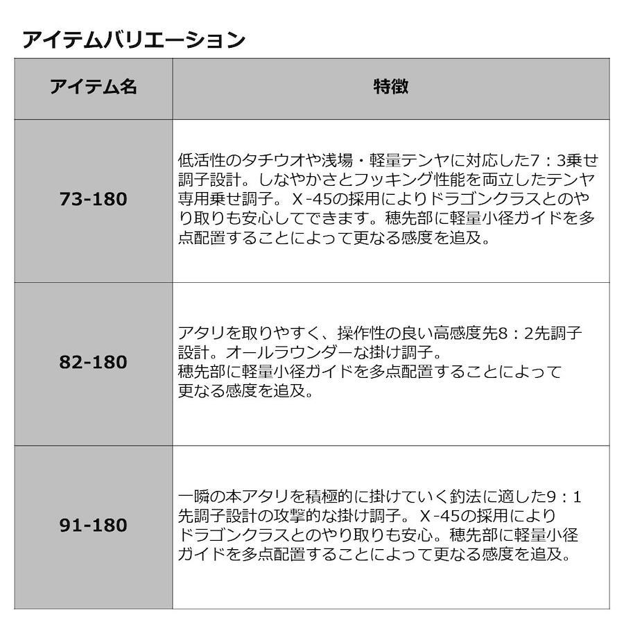 テンヤ 73-180・R 低活性のタチウオや浅場・軽量テンヤに対応した7:3乗せ調子設計。しなやかさとフッキング性能を両立したテンヤ専用乗せ調子。X45の採用により ドラゴンクラスとのやり取りも安心。穂先部に軽量小径ガイドを多点配置することによって更なる感度を追及。