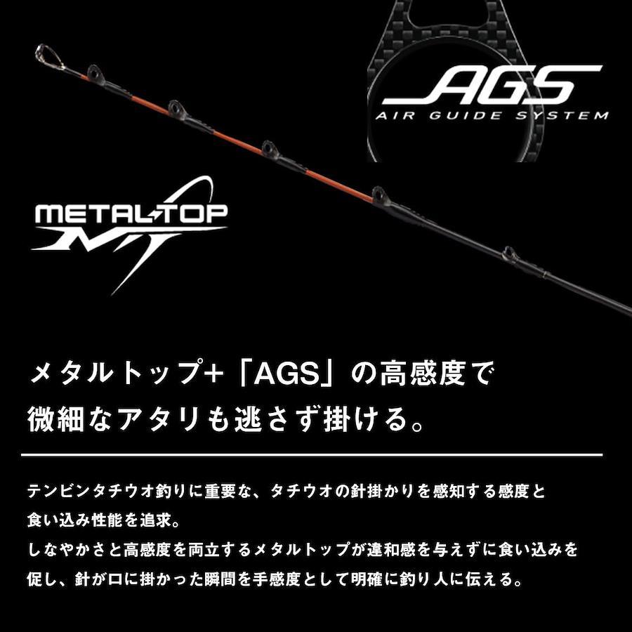 メタルトップ+『AGS』の高感度で微細なアタリも逃さず掛ける。 テンビンタチウオ釣りに重要な、タチウオの針掛かりを感知する感度と食い込み性能を追求。しなやかさと高感度を両立するメタルトップが違和感を与えずに食い込みを促し、針が口に掛かった瞬間を手感度として明確に釣り人に伝える。長く脇挟みしやすいグリップエンドや、軽量の『AGS』とゼロシートを採用することで、快適で疲労の少ない釣りを実現。水深や錘に合わせ最適な調子とパワーバランスを追求した、テンビンタチウオ専用竿のエキスパートモデル。
