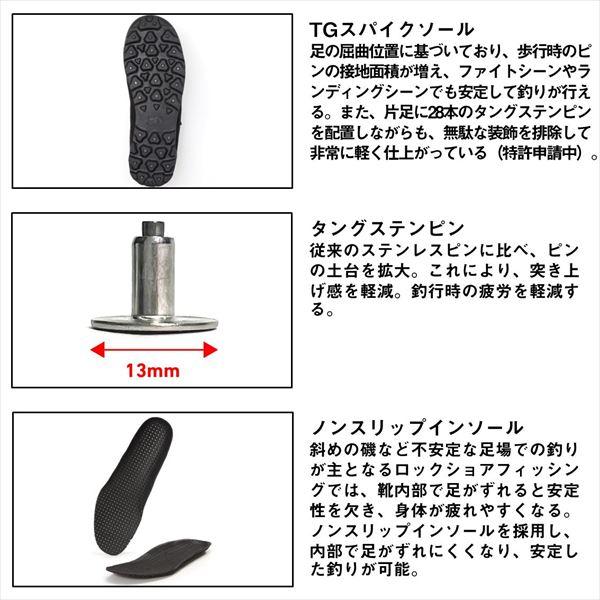 瀬川良太監修モデル。ロックショアフィッシングに必要な機能性を徹底的に追求したTGロックショアシューズ。◆TGスパイクソール。新たに足の屈曲位置を基に設計されており、従来のスパイクソールよりも屈曲性能が高い。歩行時のピンの接地面積が増え、ファイトシーンやランディングシーンでも安定して釣りが行える。◆悪い足場の磯で最も重要なグリップ性能を向上させるため、タングステンピンを採用。タングステンは従来のステンレスピンよりも高い硬度を持ち、しっかりと 磯にグリップする。また、ピンの土台を従来のステンレスピンの約1.5倍に拡大し、突き上げ感も軽減。◆アッパーには乾きやすく通気性の高いメッシュ素材を使用 ◆インソールにはノンスリップ仕様の乾きやすいインソールを採用し、靴内部での足のずれを防ぐ。斜面の磯でも驚くほど歩きやすい。◆本体とアウトソールの間に新型のEVAミッドソールを採用し、履き心地を向上。長時間釣行の疲れを軽減。 サイズ:27.5cm カラー:ブラック ソールタイプ:タングステンスパイクソール ※:入荷日が未定なため、配送日の指定はできません。他の商品と一緒にカートに入れないでください。 ※実物と色が違って見える場合があります。あらかじめご了承下さい。