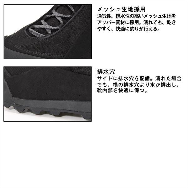 瀬川良太監修モデル。ロックショアフィッシングに必要な機能性を追求したTGロックショアシューズ。悪い足場の磯で最も重要なグリップ性能を向上させるため、タングステンピンを採用。従来のステンレスピンよりも高い硬度を持ち、しっかりと磯にグリップする。また、ピンの土台を従来のピンの約1.5倍に拡大し、突き上げ感も軽減。今回のTGスパイクフェルトソールは、フェルトにピンを固定するのではなく、アウトソールのゴムにピンを固定する方式。この設計により、ピンのぐらつきを減らし、地面に対して常にピンが立った状態をキープ。ピンの性能が最大限に発揮され、グリップ力が向上した。アッパーには乾きやすく通気性の高いメッシュ素材を使用。サイドには排水穴を配備しており、靴内部が濡れても水をしっかり排出する。インソールにはノンスリップ仕様の乾きやすいインソールを採用。靴内部での足のずれを防ぎ、斜面の磯でも驚くほど歩きやすくなった。本体とアウトソールの間に新型のEVAミッドソールを採用し、履き心地を向上。長時間釣行の疲れを軽減する。 サイズ:26.0cm カラー:ブラック ソールタイプ:タングステンスパイクフェルトソール 防水仕様:非防水 ※実物と色が違って見える場合があります。あらかじめご了承下さい。