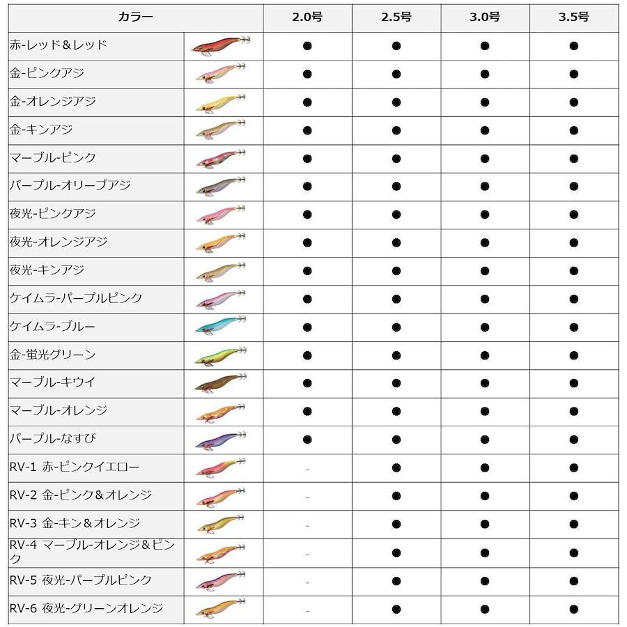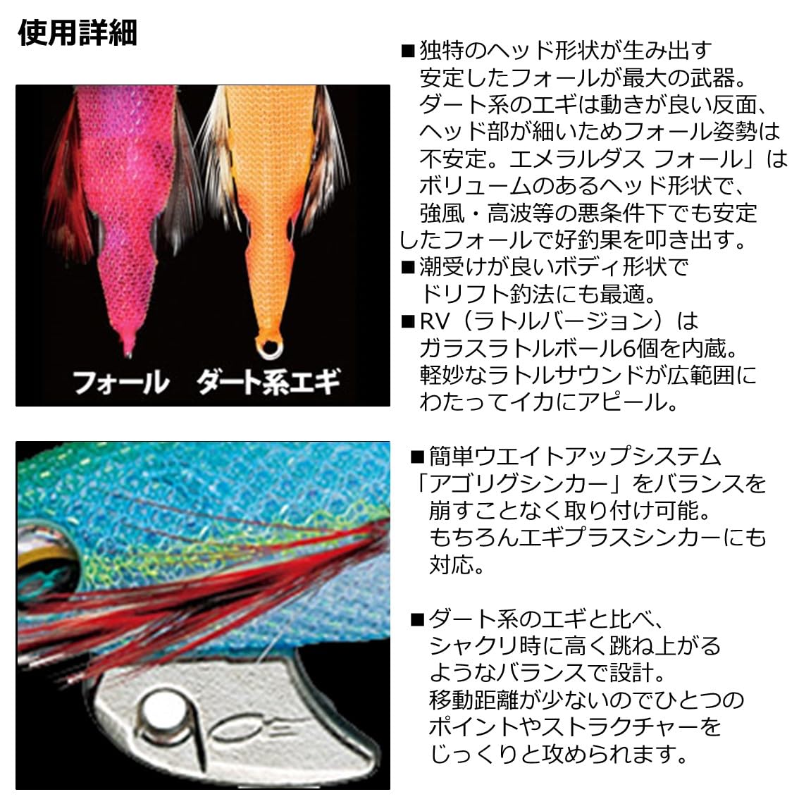 主なターゲット:アオリイカ使用可能な釣法:イカ釣りエギングエギサイズ:3.5号重量:21gフォールスピード:3.5秒/m高い跳ね上げアクションで、広いレンジにアピール可能。控え目なダート幅がダート系エギとは異なるアクションを演出。潮受けが良いボディ形状でドリフト釣法にも最適。RV(ラトルバージョン)はガラスラトルボール6個を内蔵。軽妙なラトルサウンドが広範囲にわたってイカにアピール。