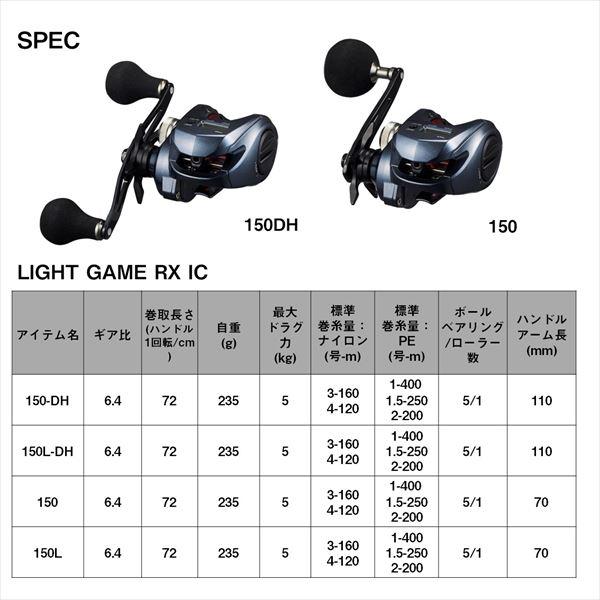 HYPER ARMED HOUSING(AL)だから高剛性。PE2号-200mと豊富なICカウンター搭載で軽量&コンパクトな手巻きリール。幅広いライトゲームに対応できる汎用モデル。HYPER ARMED HOUSING(AL)だから高負荷でもパワフルな巻上げが可能。さらにPE2号-200mと豊富なラインキャパだからタチウオ、真鯛、アジ、サバ、イサキ、ヒラメ、タイラバ、ライトジギング、イカメタル等、様々なライトゲームに活躍できるLIGHT GAME RX IC。ギア比6.4(巻取り長さ72cm)のオールラウンドタイプ。 重量(g):235 巻取長さ/ハンドル1回転(cm):72 ギア比:6.4 巻糸量(ナイロン):3号-160m、4号-120m 巻糸量(PE):1号-400m、1.5号-250m、2号-200m ベアリング:5/1 ドラグ力(kg):5 ハンドル長さ(mm):110 スプール径(mm):36 ハンドルノブタイプ:EVA ※実物と色が違って見える場合があります。あらかじめご了承下さい。