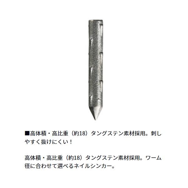 高感度!フルタングステン製ルアー用シンカー。刺しやすく抜けにくい!ワーム径に合わせて選べるネイルシンカー。高体積・高比重(約18)タングステン素材採用。ノーマルパックとお徳用PROパック。※ネコリグ、ワッキーリグetc 重量(g):1.3 入数:15 ※実物と色が違って見える場合があります。あらかじめご了承下さい。