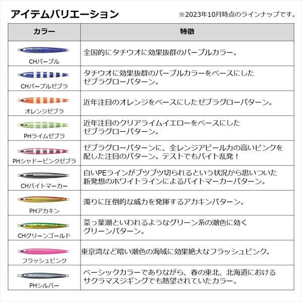 タチウオスロージギングゲーム対応セミロング設計。食い渋り時のタチウオの捕食行動を研究し、行き着いた非対称セミロング設計。スローピッチジャークによるタチウオゲームはジャークのアクションで素直に呼応しフォールでしっかりジグを見せて食わせるアクション。タチウオの鋭い歯にもはがれにくいHD塗装を施し対応。フックは鏡牙フックSSツインアシスト&チラシアシストがベストマッチ。(HD塗装:タチウオの鋭い歯にも耐える高耐久塗装処理) サイズ:145mm 自重:130g ※実物と色が違って見える場合があります。あらかじめご了承下さい。
