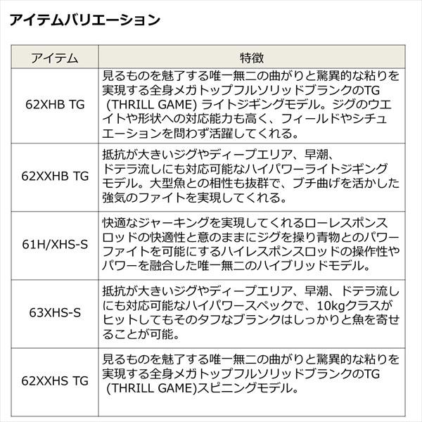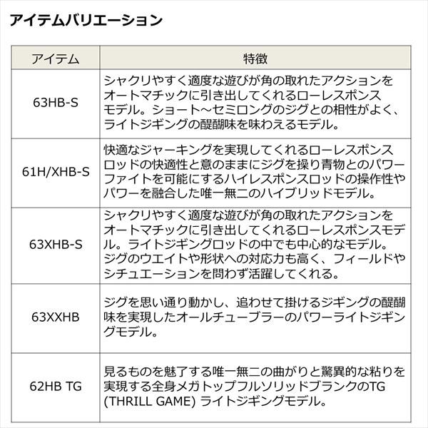 ローレスポンスとハイレスポンスのメリットが融合したハイブリット・ベイトモデル。快適なジャーキングを実現してくれるローレスポンスロッドの快適性と意のままにジグを操り青物とのパワーファイトを可能にするハイレスポンスロッドの操作性やパワーを融合した唯一無二のハイブリッドモデル。ティップ部はバイトを弾きにくい柔軟なカーボンソリッドメガトップを採用。ガイドは軽量・高感度の「AGS」を搭載。金属ガイドと比較し、抜けの良い軽快なロッドアクションの実現はもちろん、潮流の強弱、ジグのアクション、魚のチェイスなどの海中状況の感知能力も大きく向上。61H/XHB-Sはスーパーライトジギング、ライトジギング、スロージギングそれぞれのロッドの良さを高次元で融合することに成功したライトジギングロッドの金字塔ともいえるモデル。ジグのウエイトや形状への対応力も高く、フィールドやシチュエーションを問わず活躍してくれる。 全長:1.85m 継数:1 仕舞寸法:185cm 自重:133g 先径/元径:1.1mm/7.9mm ジグ重量:60-160g 適合ラインPE:0.8-1.5号 カーボン含有率:88% ※実物と色が違って見える場合があります。あらかじめご了承下さい。