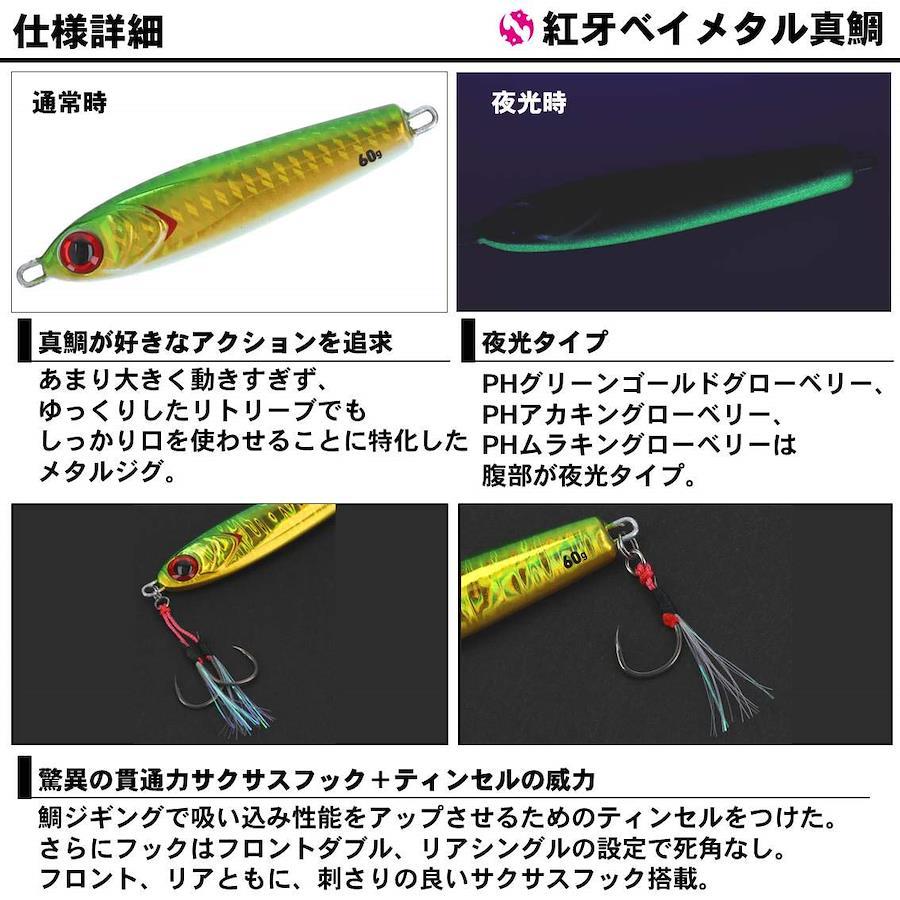 カラー: PHアカキングローベリー自重(g): 40鯛ジギングで求められる性能を凝縮し、完成させた紅牙のフック付きメタルジグ。真鯛が好きなアクションを追求。驚異の貫通力サクサスフック+ティンセルの威力。【免責事項】※メーカーのリニューアルに伴い仕様・カラー等が予告無く変更になる場合がございます。新パッケージでお届け致します事ご了承願います。