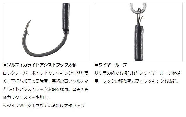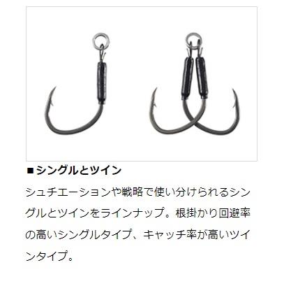 サワラ・タイ・青物の混合狙いで威力を発揮するリア専用のアシストフック。ワイヤーのループはサワラやタチウオの歯でも切られにくくフックが自由に稼働するのでフッキング率も高い。サワラだけでなく大型青物にも負けない太軸フック採用。驚異の貫通力サクサスフック。 タイプ:リアシングル サイズ:#3/0 自重:約1.9g 入数:3 目安ジグサイズ:ライトジギング対応の80-200g相当のジグ。 ※実物と色が違って見える場合があります。あらかじめご了承下さい。