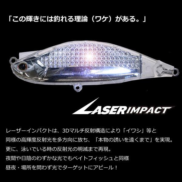 スラローム系ぶっ飛びファットシャッドシンペン「FASHAD100S」にレーザーインパクト搭載モデルが登場!タイトローリング&ワイドS字スラローム2WAYアクションのぶっ飛びファットシャッドシンペン「Lazy FASHAD」にレーザーインパクト搭載モデルが登場!ファットシャッドシンペンながら飛距離はAve72.3m、Max76.0m!沖のボイルも直撃可能!レーザーインパクトは、3Dマルチ反射構造により「イワシ」等と同様の高輝度反射光を多方向に放ち、「本物の誘いを遠くまで」を実現。更に、泳いでいる時の反射光の明滅まで再現!夜間や日陰のわずかな光でもベイトフィッシュと同様、昼夜・場所を問わず光でターゲットにアピール! 全長:100mm 重量(g):32 タイプ:シンキング フック:#2 トレブル リング:#4 飛距離(m):最大76.5m、平均72.3m レンジ:0.3~約1.5m アクション:タイトローリング&スラローム2WAYアクション ※実物と色が違って見える場合があります。あらかじめご了承下さい。