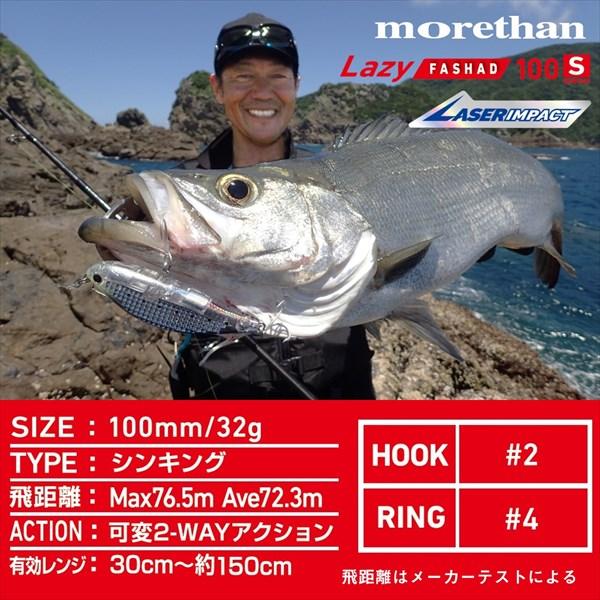 タイトローリング&ワイドS字スラローム2WAYアクションのぶっ飛びファットシャッドシンペン「Lazy FASHAD」にレーザーインパクト搭載モデルが登場!ファットシャッドシンペンながら飛距離はAve72.3m、Max76.0m!沖のボイルも直撃可能!レーザーインパクトは、3Dマルチ反射構造により「イワシ」等と同様の高輝度反射光を多方向に放ち、「本物の誘いを遠くまで」を実現。更に、泳いでいる時の反射光の明滅まで再現!夜間や日陰のわずかな光でもベイトフィッシュと同様、昼夜・場所を問わず光でターゲットにアピール! タイプ:シンキング サイズ:100mm 標準自重:32g 有効レンジ:30~約150cm アクション:可変2WAYアクション 飛距離:最大76.5m、平均72.3m フック仕様:♯2トレブル ※実物と色が違って見える場合があります。あらかじめご了承下さい。