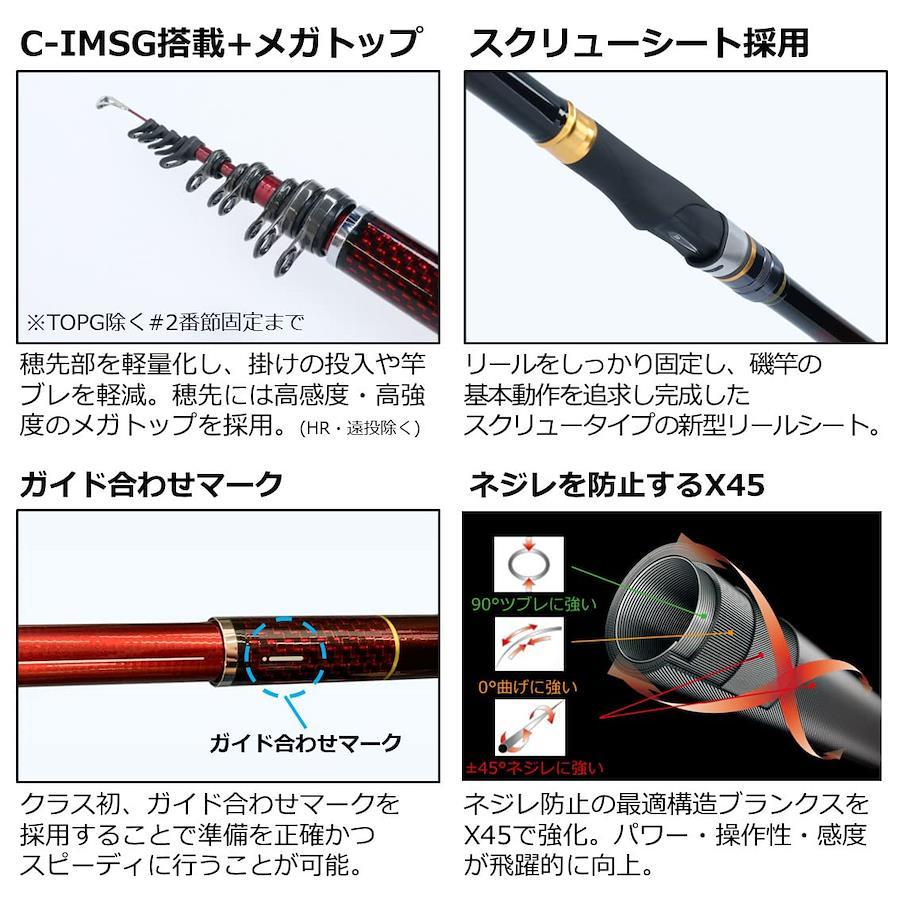 使いやすい機能を満載したダイワ上物竿のスタンダードモデル。振りこみやすく、曲がってしっかり魚を浮かせる使いやすいブランクス設計。あらゆる番手のリールもきっちり保持する新型スクリューシート搭載。FUJI 製カーボン樹脂フレームガイド(C-IMSG)を穂先部(♯2固定まで)に採用することで、軽快な竿さばきを実現。ガイド合わせマークを搭載し、昼夜問わず初心者でもズレなくガイドをセッティング。キャスト時のブレやネジレを防ぐX45搭載。ワーと粘りを兼ね備えたHVFブランクス仕様。高級感と光輝性を併せ持つ本体デザイン。竿尻にはTOURNAMENTで採用されている新触感塗装を採用し、肘へのホールド性をUP。オールラウンドモデルはFUJI製軽量カーボン樹脂フレームC-IMSGを搭載(#2固定まで)することで、シャープな振り心地を実現したと同時に糸絡みを減少。食い込みが良く、かつ高感度・高強度ソリッドメガトッ プに加え、ダイワオリジナルスクリューシート搭載でリールのガタツキを軽減。掛けてからは胴 まで力がスムーズに伝わり、タメて獲る調子を実現。
