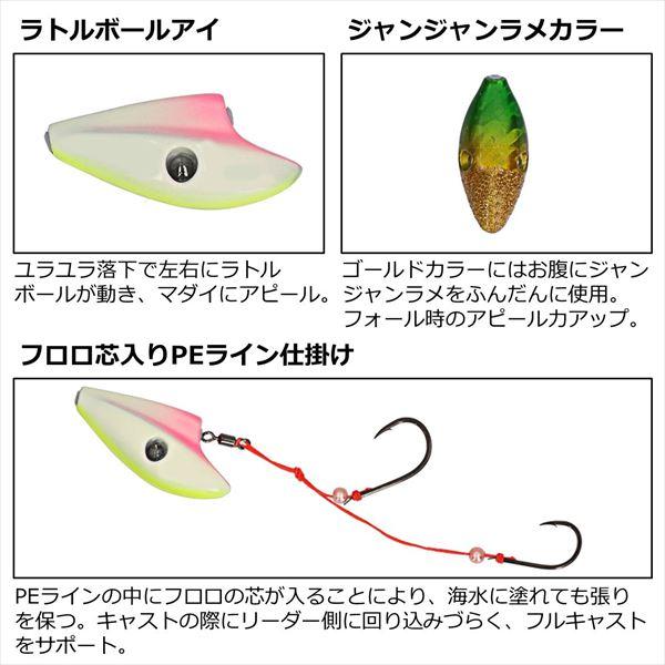 ユラユラフォールでマダイを誘う!!テンションフォールではユラユラ落下!ボトムトレースしやすいボート形状遊動テンヤがパワーアップして登場!■ラトルボール音でマダイにアピール!■リーダーを傷つけにくいオリジナル高強度POMパイプ搭載!■キャストしても絡みづらいフロロ芯入りPEライン!■驚異の貫通力サクサスフックを親針・孫針に搭載!フッキング率UP!■驚異の回転力サクサススイベル搭載!糸ヨレ激減! サイズ:12号 フックタイプ:サクサスフック ※実物と色が違って見える場合があります。あらかじめご了承下さい。