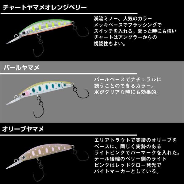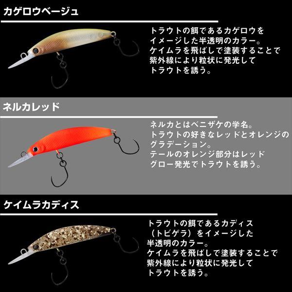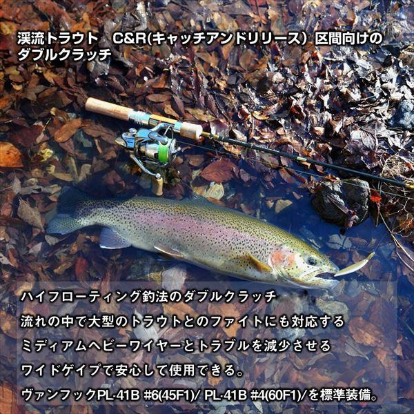 渓流トラウト、C&R(キャッチアンドリリース)区間向けにフックと専用カラーでカスタムしたダブルクラッチ。自然渓流の禁漁時期にも渓流トラウトフィッシングを楽しみたいアングラーに向け、C&R区間がある。C&R区間に放流されるトラウトは養殖池で育ったものが多く、川のプール状になっている場所やよどみなど流れの緩いところに付くため、早い流れの中で使う渓流ルアーではなく、スローに誘う事の出来るルアーへの反応が良いためエリアトラウトルアーをC&R区間モデルとしてカスタム。 また、C&R区間だけでなく ストリームタイプのエリアトラウトもあり、もちろんここでの使用も可能。重心移動によりキャスタビリティに優れた60F1とコンパクトで細身ボディによるスレた魚にも使いやすい45F1は浮力を活かした「巻いて止める」のハイフローティング釣法がおすすめ。流れの中で大型のトラウトとのファイトにも対応するミディアムヘビーワイヤーとトラブルを減少させるワイドゲイプで安心して使用できるヴァンフックME-41Bを使用。 全長:45mm 重量(g):1.6 タイプ:ハイフローティング フック:ヴァンフックME-41B #6 リング:#0 ※実物と色が違って見える場合があります。あらかじめご了承下さい。