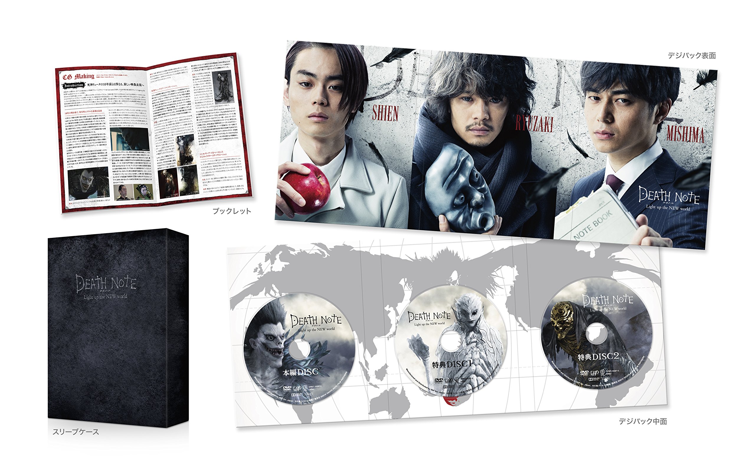 【商品概要】Blu-ray VPXT-71512 (JAN:4988021715126) 7,777+税カラー/2層/16:9 シネスコ1080p High-Definition/DTS-HD Master Audio5.1ch/リニアPCM2.0ch音声)1日本語リニアPCM2.0ch 2日本語DTS-HD MasterAudio5.1ch/日本語字幕(本編のみ)Blu-ray・DVD共通DISC1:本編135分+予告編集・三島・竜崎ほかデスノート対策本部メンバーによるオーディオコメンタリー(東出昌大、池松壮亮、藤井美菜、青山草太、竹井亮介、大迫一平、大塚ヒロタ)→オーディオコメンタリーは、complete setの本編DISC1のみ収録になります。通常版には収録されません。・予告編集…特報、本予告、TV SPOTほか、話題の映像クリエイト集団「BRDG」×「デスノート」のスペシャルスポット(各9秒ver.)を収録!→通常版にも収録DISC2:・メイキング(60分予定)+Huluオリジナルドラマ「NEW GENERATION」(61分)DISC3:・舞台挨拶集…ジャパンプレミア舞台挨拶、イッキ見上映(デスノート/デスノート the Last name)、初日舞台挨拶、大ヒットファン感謝祭in佐野、香港プレミア・座談会集…スペシャル座談会、豪華キャストスペシャル座談会・戸田恵梨香スペシャルインタビュー・デスノート大好き芸人トーク封入特典:ブックレット※仕様・特典等は予告なく変更になる場合がございます。予めご了承下さい。あの事件から10年─これで、すべてを終わらせる。2016年10月29日スクリーンに復活した劇場版最新作「デスノート Light up the NEW world」のBlu-ray&DVDがいよいよ4月19日に発売!前作から10年ぶりに復活した劇場版最新作「デスノート」。今作は新キャスト、新たなルールにより、映画公開前から大きな注目を集めました。【イントロダクション】2003年、原作・大場つぐみ、作画・小畑健により「週刊少年ジャンプ」で読み切りが掲載され、同年12月から2006年5月まで連載された伝説的コミック「デスノート」。2006年に公開された実写映画『DEATH NOTE』、『DEATH NOTE the Last name』、2008年に公開されたスピ