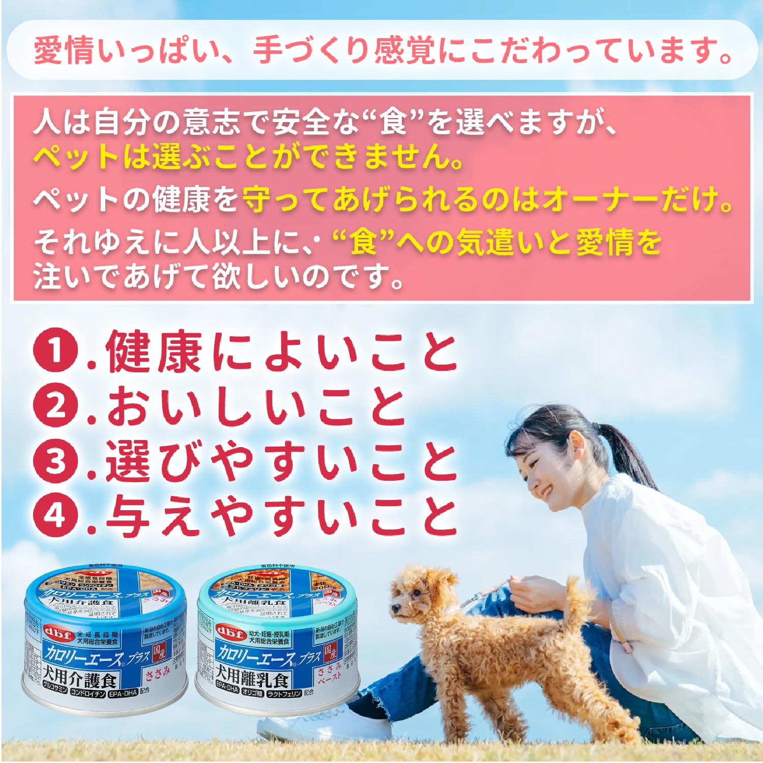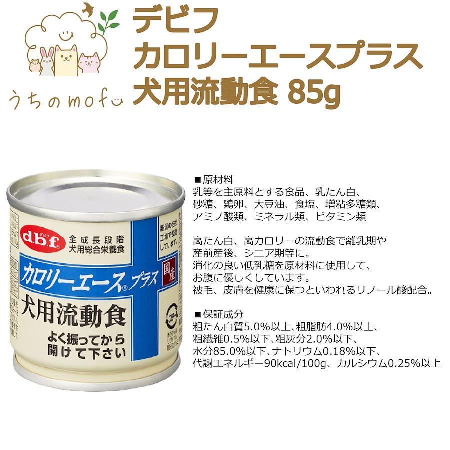 1日に必要な栄養をバランスよく摂ることができ、大切なワンちゃんの健康を支えます カロリーエースプラス(犬用流動食) 85g ■原材料 乳等を主原料とする食品、乳たん白、砂糖、鶏卵、大豆油、食塩、増粘多糖類、アミノ酸類、ミネラル類、ビタミン類 高たん白、高カロリーの流動食で離乳期や産前産後、シニア期等に。 消化の良い低乳糖を原材料に使用して、お腹に優しくしています。被毛、皮膚を健康に保つといわれるリノール酸配合。 ■保証成分 粗たん白質5.0%以上、粗脂肪4.0%以上、粗繊維0.5%以下、粗灰分2.0%以下、水分85.0%以下、ナトリウム0.18%以下、代謝エネルギー90kcal/100g、カルシウム0.25%以上