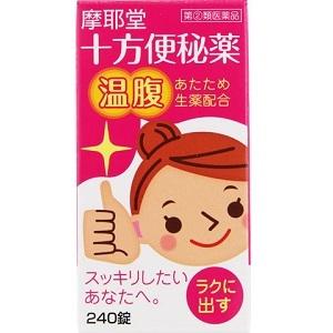 ■商品概要メーカー:摩耶堂製薬商品名:十方便秘薬 240錠医薬品分類:指定第2類医薬品区分:OTC医薬品小児用区分:兼用薬剤形状:錠剤・丸剤・カプセル内容量:240錠商品概要:あたため生薬配合【使用期限】出荷時点で使用期限終了まで1年以上JANコード:4987210420018商品コード:072801408■初回添付文書作成年月および改訂年月、添付文書版番号初回作成:1998/09改訂:2017/09HC125A-01ご使用に際して、この説明文書を必ずお読みください。また、必要な時に読めるよう大切に保存してください。■特徴やさしく出したいあなたへ。ただ出すだけではなく、あなたの身体への負担を和らげながら、便秘の原因に効果的なお薬です。便秘にしっかり効く便通生薬ダイオウ、センナ、アロエをバランスよく配合しているので、多様な便秘に効果を発揮します。お腹が痛くなりにくい鎮痛生薬カンゾウ、シャクヤク、ショウキョウ、ガジュツが効き目に伴う痛みを和らげます。さらに身体を温める3種の生薬 温腹 あたため生薬配合ケイヒ、ショウキョウ、ガジュツが身体の中から温め、冷えを緩和します。■してはいけないこと(守らないと現在の症状が悪化したり、副作用が起こりやすくなります。)1.本剤を服用している間は、次の医薬品を服用しないでください。 他の瀉下薬(下剤)2.授乳中の人は本剤を服用しないか、本剤を服用する場合は授乳を避けてください。3.大量に服用しないでください。■相談すること1.次の人は服用前に医師、薬剤師又は登録販売者に相談してください。(1)医師の治療を受けている人(2)妊婦又は妊娠していると思われる人(3)薬などによりアレルギー症状を起こしたことがある人(4)次の症状のある人 はげしい腹痛、吐き気・嘔吐2.服用後、次の症状があらわれた場合は副作用の可能性があるので、直ちに服用を中止し、この文書を持って医師、薬剤師又は登録販売者に相談してください。〔関係部位〕 〔症 状〕皮 膚 : 発疹・発赤、かゆみ消化器 : はげしい腹痛、吐き気・嘔吐3.服用後、次の症状があらわれることがあるので、このような症状の持続又は増強が見られた場合には、服用を中止し、この文書を持って医師、薬剤師又は登録販売者に相談してください。下痢4.1週間位服用しても症状がよくならない場合は、服用を中止し、この文書を持って医師、薬剤師又は登録販売者に相談してください。■効能・効果●便秘 ●便秘に伴う次の症状の緩和:頭重、のぼせ、肌あれ、吹出物、食欲不振(食欲減退)、腹部膨満、腸内異常発酵、痔■用法・用量次の量を就寝前(又は空腹時)に、水又はお湯で服用してください。ただし、初回は最小量を用い、便通の具合や状態をみながら、少しずつ増量又は減量してください。〔 年 齢 〕 成人(15歳以上)〔1 回 量 〕 6~8錠〔1日服用回数〕 1回〔 年 齢 〕 11歳以上15歳未満〔1 回 量 〕 4~6錠〔1日服用回数〕 1回〔 年 齢 〕 7歳以上11歳未満〔1 回 量 〕 3~4錠〔1日服用回数〕 1回〔 年 齢 〕 7歳未満〔1 回 量 〕 服用しないこと〔1日服用回数〕 服用しないこと<用法・用量に関連する注意>(1)用法・用量を厳守してください。(2)小児に服用させる場合には、保護者の指導監督のもとに服用させてください。■成分・分量8錠(成人1日最大服用量)中に次の成分を含有しています。ダイオウ末・・・・・・・・・・・・・・・・・・0.6gセンナ末・・・・・・・・・・・・・・・・・・・0.3gアロエ末・・・・・・・・・・・・・・・・・・・0.3gシャクヤク末・・・・・・・・・・・・・・・・・0.2gカンゾウ末・・・・・・・・・・・・・・・・・・0.2gケイヒ末・・・・・・・・・・・・・・・・・・・0.1gショウキョウ末・・・・・・・・・・・・・・・・0.1gガジュツ末・・・・・・・・・・・・・・・・・0.15g添加物としてタルクを含有します。■保管及び取扱上の注意(1)直射日光の当たらない湿気の少ない涼しい所に密栓して保管してください。(2)小児の手の届かない所に保管してください。(3)他の容器に入れ替えないでください。(誤用の原因になったり品質が変わることがあります。)(4)ビンのフタはよくしめてください。しめ方が不十分ですと湿気などのため変質することがあります。また、本剤をぬれた手で扱わないでください。(5)ビンの中の詰め物は、輸送中に錠剤が破損するのを防ぐためのものです。開封後は不要となりますので取り除いてください。(6)箱とビンの「開封年月日」記入欄に、ビンを開封した日付を記入してください。(7)一度開封した後は、品質保持の点からなるべく早く服用してください。(8)使用期限を過ぎた製品は服用しないでください。■その他の添付文書記載内容〔飲み方アドバイス〕まずは最小量から症状に合わせて1錠ずつ増量または減量してください。少しずつ調整することで、あなたの状態に合った服用量を見つけてください。いつ飲むの~おやすみ前にお飲みになると、翌朝にスッキリと効果があらわれます。和漢のチカラを科学し、あなたへ。~摩耶堂製薬~漢方薬に日本の生