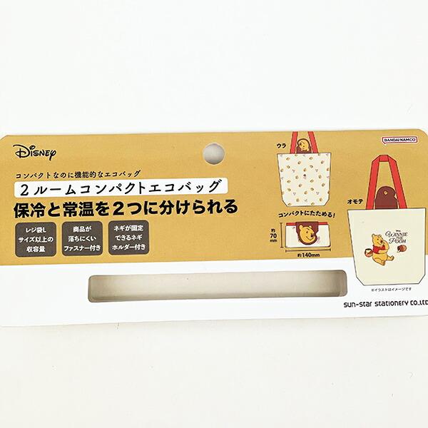 くまのプーさんの2ルームコンパクトエコバッグです。コンパクトなのにレジ袋Lサイズ以上の収納量で常温と保冷に仕分けられる便利なエコバッグです。小さいものを入れるのに便利なメッシュポケット付きが嬉しいポイント☆底板付きで商品も安定して安心。珍しいネギを固定できるホルダーが付いているなんて嬉しすぎます♪軽量でコンパクトになるので持ち運びも便利です!!全国のママさんぜひこれ使ってみてください☆