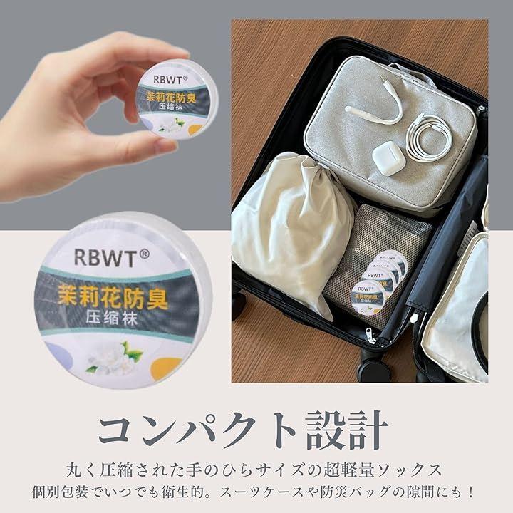 「持ち運びラクラクの圧縮設計」 使い捨て靴下は1足ずつ手のひらサイズに圧縮されており、旅行バッグや防災バッグ、出張用スーツケースにもスッキリ収まります。