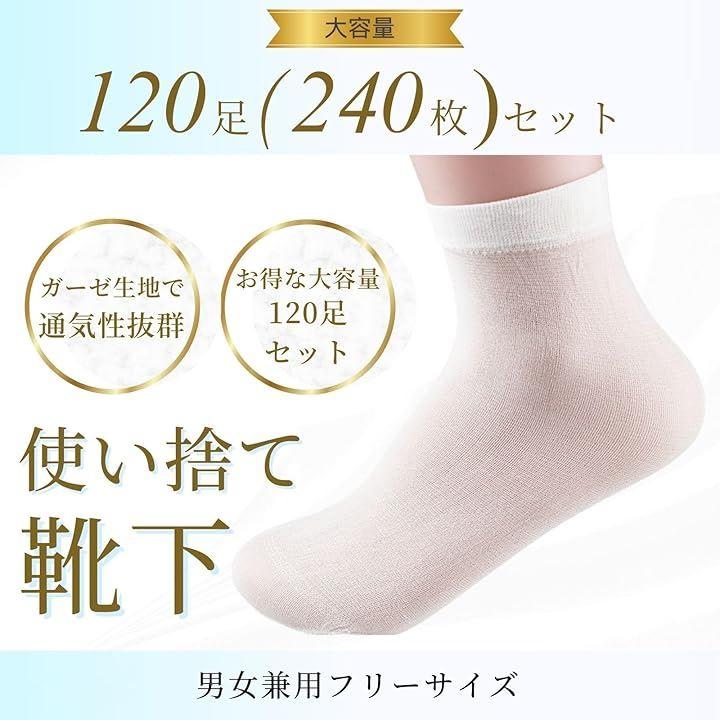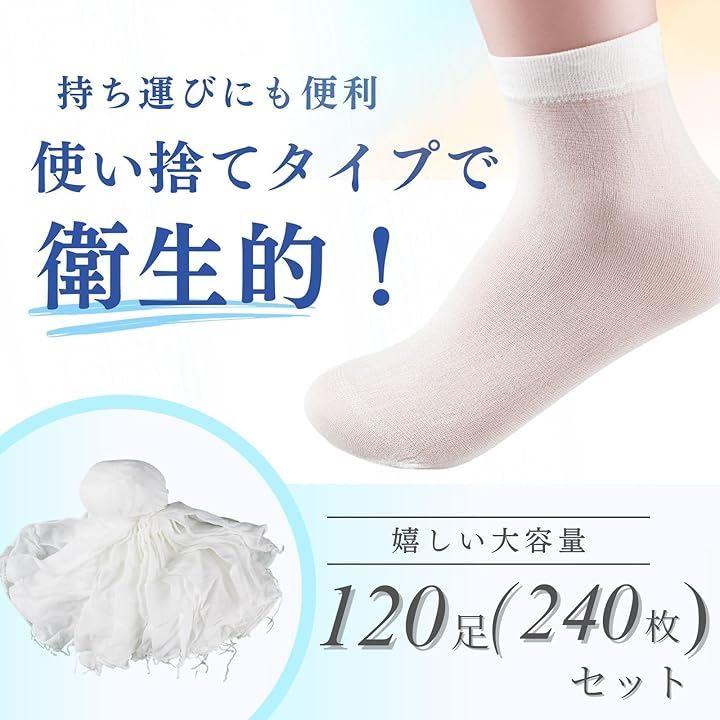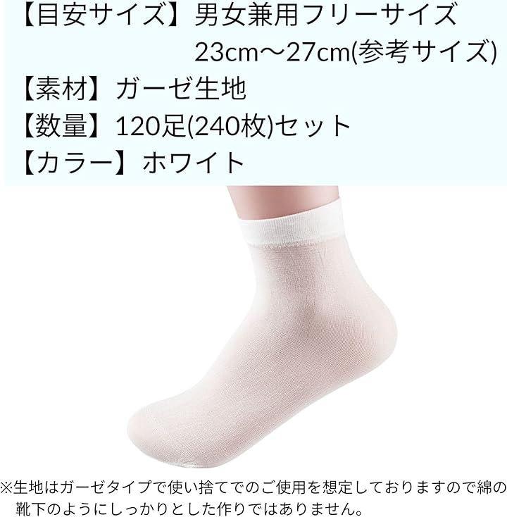 「サイズ」男女兼用フリーサイズ約23~27cm(参考サイズ)「素材」ガーゼ生地「内容」120足(240枚)セット*生地はガーゼタイプで使い捨てでのご使用を想定しておりますので綿の靴下のようにしっかりとした作りではありません。