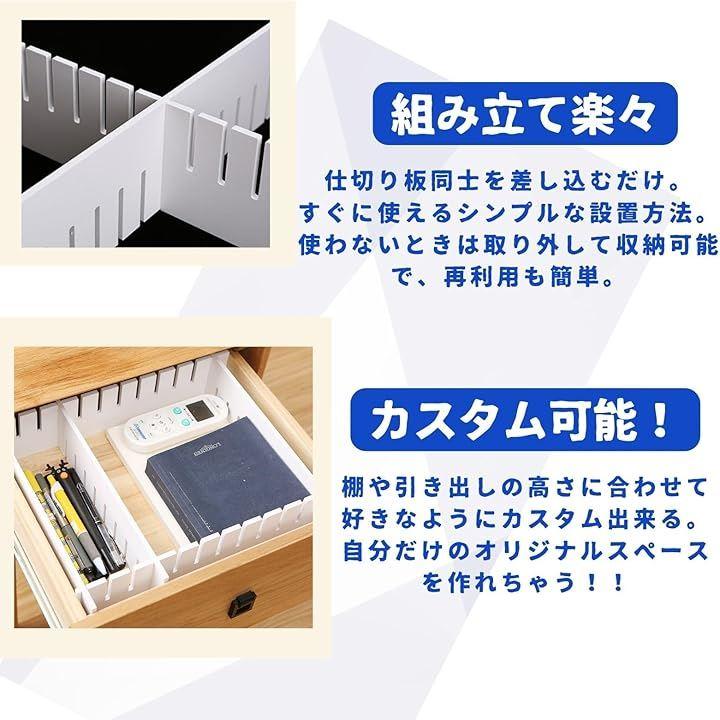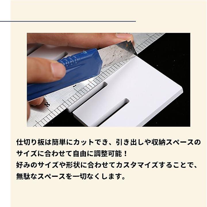 「仕切り板セット」多用途対応のカスタマイズ可能な収納ソリューション 「自由なカットでピッタリ設置」 仕切り板は簡単にカットでき、引き出しや収納スペースのサイズに合わせて自由に調整可能。好みのサイズや形状に合わせてカスタマイズすることで、無駄なスペースを一切なくします。
