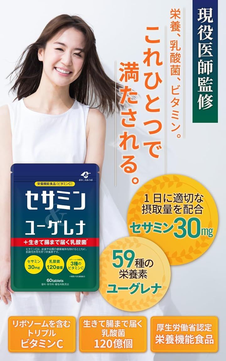 セサミン、リポソーム、乳酸菌を黄金比で配合した、次世代オールインワン・サプリメントです。