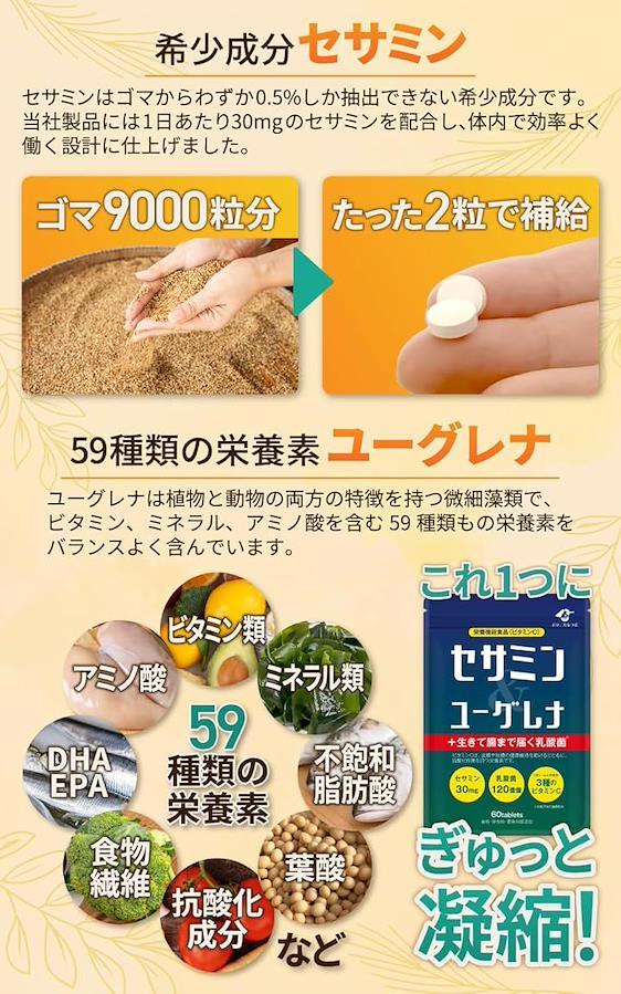 原材料 乳糖(オランダ製) ゴマエキス末(ゴマを含む) 乳酸菌末(乳酸菌(殺菌) デキストリン) 有胞子性乳酸菌 ユーグレナ粉末 イソマルトオリゴ糖 乳酸菌混合末(デキストリン 乳酸菌混合末(ビフィズス菌5種 乳酸菌17種) 乳糖(乳成分を含む) 加工油脂 脂肪酸/セルロース ビタミンC ステアリン酸カルシウム 微粒酸化ケイ素 ヒマワリレシチン ビタミンP