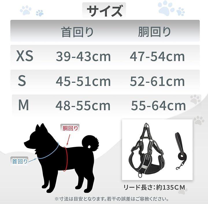 夜間の散歩も安全な反射素材が取り入れられ、胴輪のサイズはXS、S、Mが選択可能。