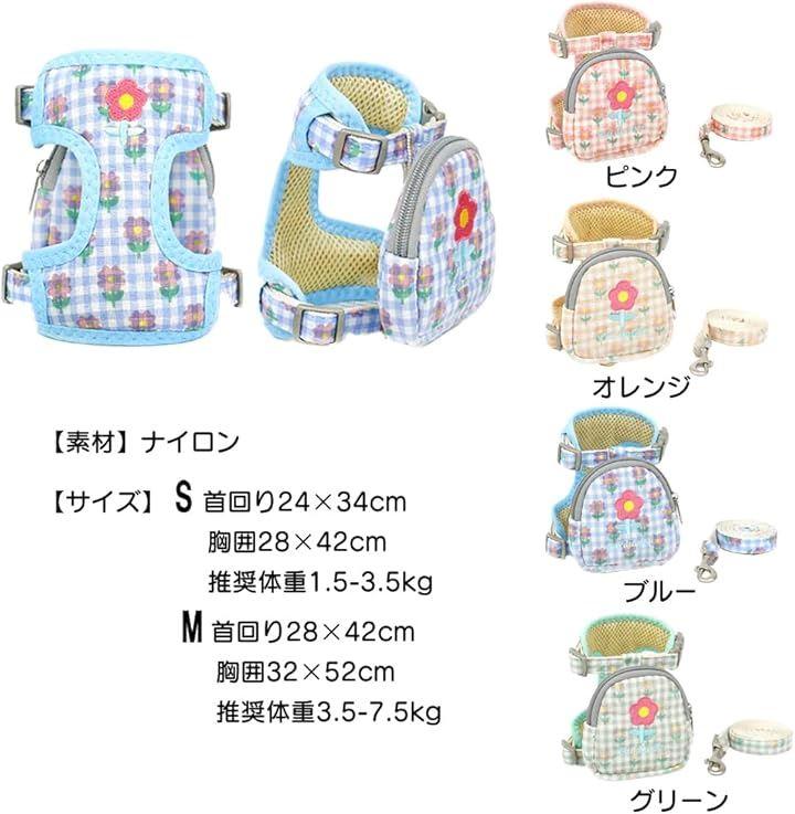 「素材」ナイロン「カラー」ピンク、ブルー、グリーン、オレンジ「サイズ」S: 首回り24⁻34cm 胸囲28⁻42cm 推奨体重1.5-3.5kg、M:首回り28⁻42cm 胸囲32⁻52cm 推奨体重3.5-7.5kg