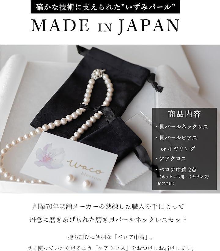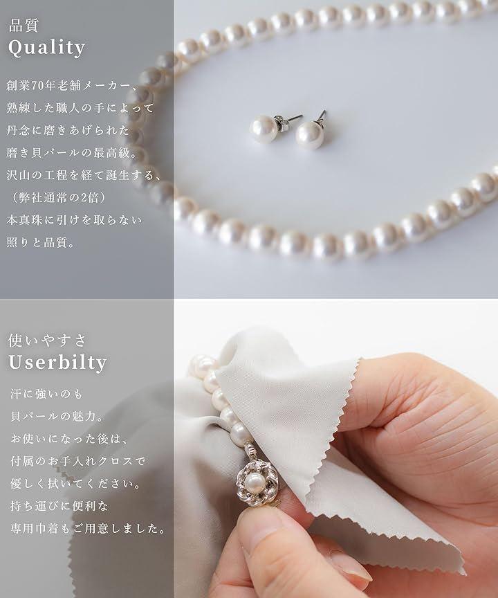 「商品内容」貝パール ネックレス 40cm / ネックレス用 ベロア巾着袋 (大) / 貝パール ピアス x 2個 / ピアス用 ベロア巾着袋(小)/ ケアクロス