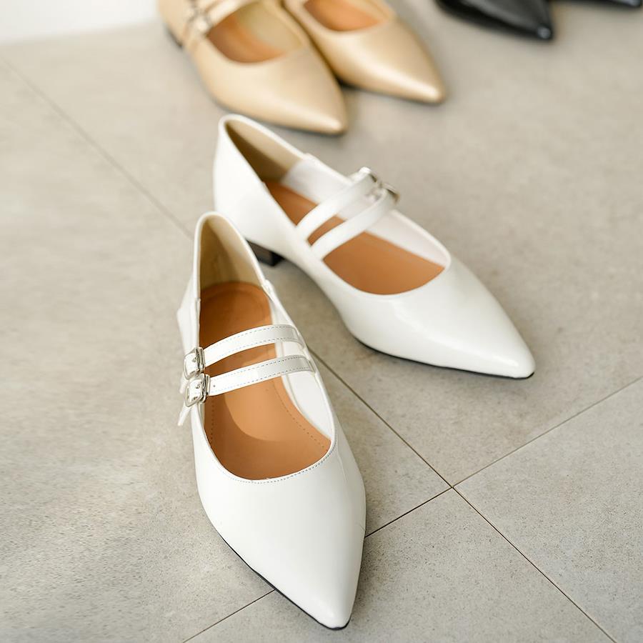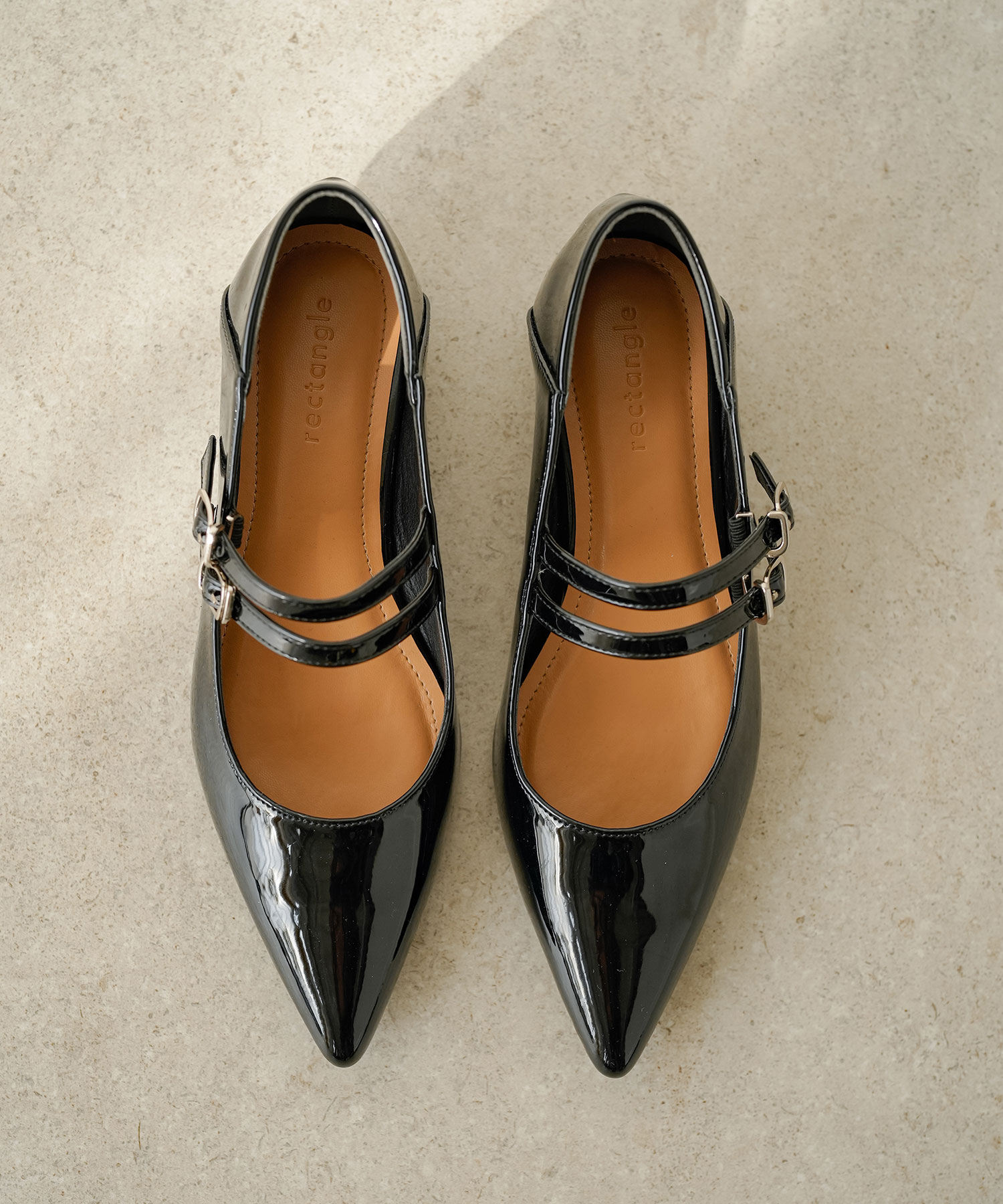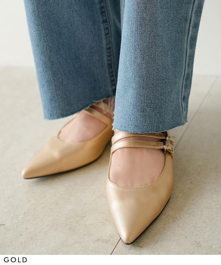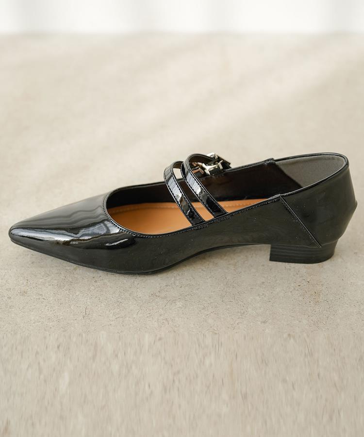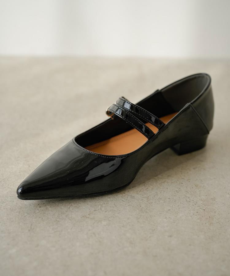 あらゆるシーンに活躍するダブルストラップパンプス1.大人の女性に向けたメリージェーンパンプスシャープなポインテッドトゥと細身のストラップの絶妙なバランスが女性らしい1足。ラウンドの深さや角度も細部までこだわり、足元が美しく見えるラインに仕上げました。2. オールシーズン活躍する艶やかなエナメル生地(ブラック・アイボリー)上品な艶が高見えし、幅広いシーンに活躍!スーツやワンピースを合わせたフォーマルシーンやオケージョンスタイルからデニムやスラックス合わせのカジュアルスタイルまで1足であらゆるシーンに対応。ゴールドは、光りすぎないマットなスムーズ生地を使用。落ち着いた色味ですが、コーデのポイントになってくれるカラーです。3.安定感のあるローヒールとバブーシュ仕様2cmのローヒール。インソールに低反発クッションを入れ、疲れにくい仕様にこだわりました。踵部分を切り替えたバブーシュ仕様になっているので、後ろを踏んでも着用可能です。4.ストラップ2本のストラップで足をしっかりと固定。引っ掛けるだけのフックタイプなので、着脱もラクチン。足幅、甲の高さに合わせてホールの段階調整が可能です。《サイズ感》普段のパンプスサイズと同じサイズ感で問題ありませんでした。厚手の靴下を着用される場合はワンサイズアップされるのがおすすめです。《生産国》中国