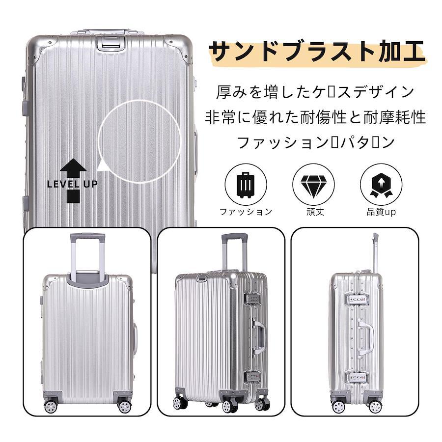 【航空宇宙グレード素材】スーツケースは100%高衝撃航空宇宙グレードのアルミニウム・マグネシウム合金で作られています。高い弾力性と耐変形性を持ち、市場でABS素材を使用した製品よりも頑丈で耐久性があり、ABS+PCスーツケースよりも軽くて持ち運びやすいてす。ケースに使用されているアルミニウム合金は耐酸化性、耐圧性、防水性、耐摩耗性、スタイリッシュさ&超軽量、耐衝撃性、耐落下性に優れ、最も実用的な堅牢性と安全性を実現する高水準の素材です。200KGの重さに耐えられます。 【多段調節キャリバ&人間工学に基づいたハンドル】厚く強化された超軽量のアルミニウム製キャリバー、高さ多段階調節、ご自分の身長に合わせてスムーズに調整が可能です。3000回のテストの結果、揺れを最小限に抑えて、ケースとトロリーバーの接合部に0.1~0.3cmの隙間を空ける設計を採用した。この設計は熱伸縮を防ぎ、でこぼこ道をスーツケースを引っ張る疲労を軽減します。耐振性に優れるデザインで荷物を引きかける時、しっかりしています。人間工学に基づいた新しいハンドルは、自動的にスプリングバックし、手になじむ上質な感触で使いやすいです。 【TSAロック搭載&360度回転耐衝撃静音ダブルキャスター】国際的に通用する米国運輸保安局のTSA Lockの設計を採用し、預けても自由に開閉でき、破損を防ぎます。キャスターは高弾性TPE衝撃吸収素材を使用しており、より静かで耐摩耗性に優れています。振動やノイズを抑え、リバウンド性能もさらに向上しています。また、スムーズな滑りを提供しながら、360度自由に旋回することができます。ダブルキャスターデザインにより、移動がより簡単で快適になります。角部にどれも強化されていて、衝撃をより効果的に吸収し、より長い耐用年数を提供します。側面には摩擦防止のラバーパッドも付いています。 【オールアルミ合金板のコーナーラッピング&収納力抜群】厚くなったアルミ合金板で角を包み、四隅は丸みを帯びたデザインで、衝突を恐れず、箱本体を効果的に保護する。スーツケースの中、V型ベルト*2が完備され、荷物崩れを完全防止します。収納しにくい小物もメッシュポケットから一目で確認できます。パーティション*2は、異なるタイプの手荷物を分け、適切に分類するのにも最適てす。このスーツケースは収納力抜群、たくさんの