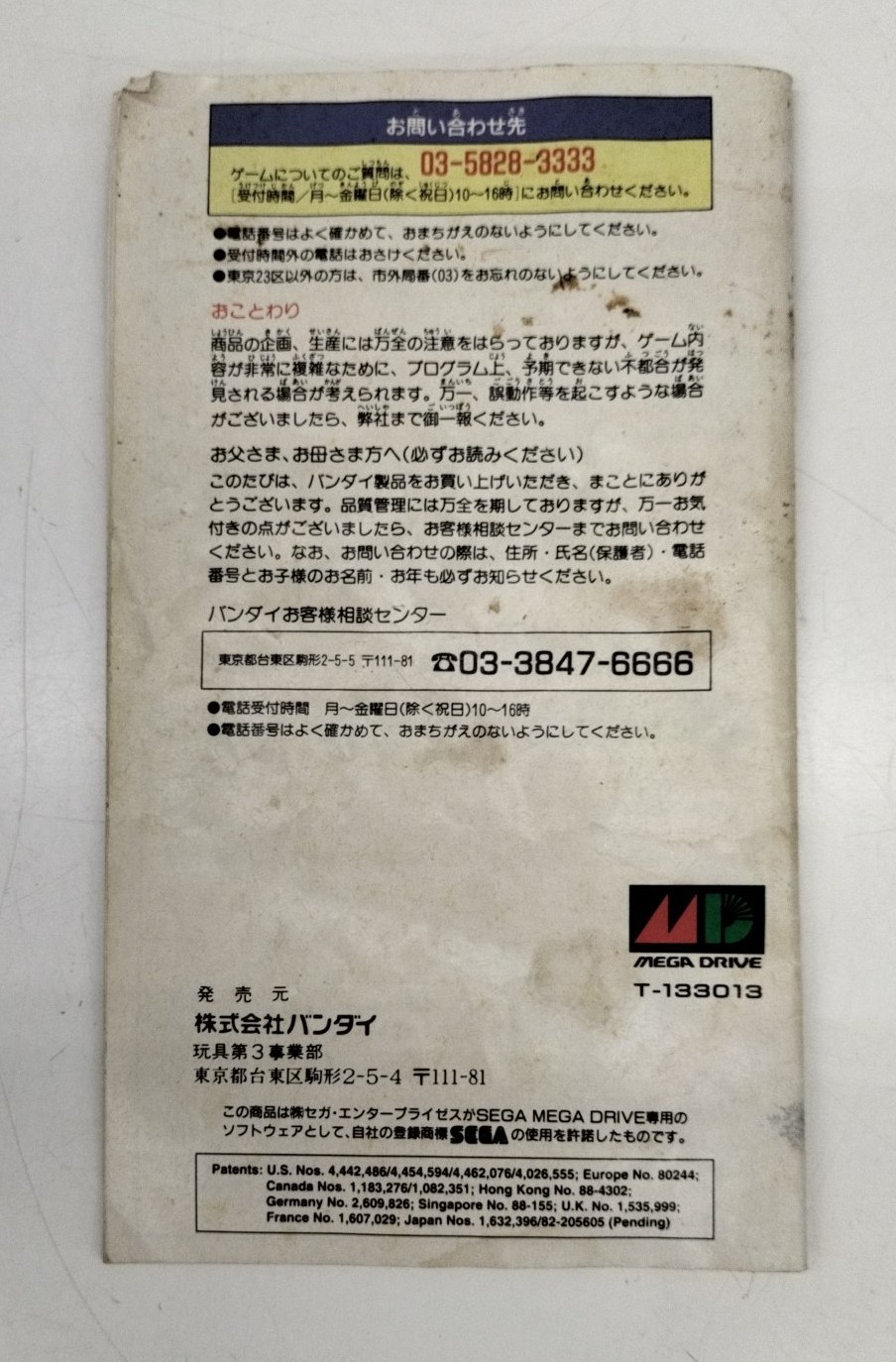 ■備考メガドライブ用。ソフトのラベル一部剥がれと破れあり。取説にキズ・汚れあり