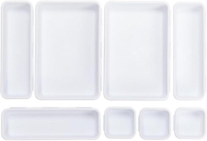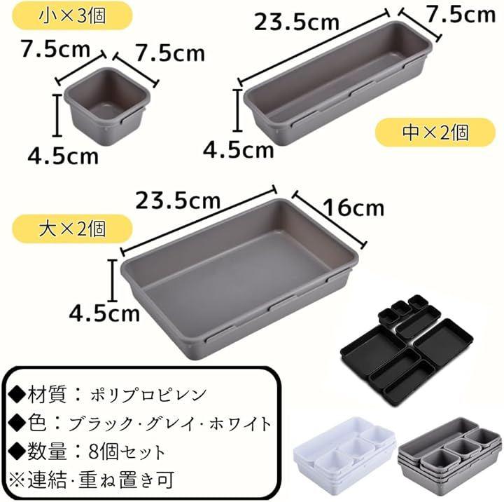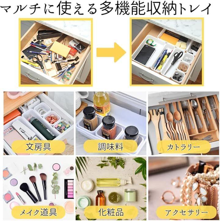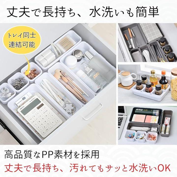 「複数サイズで幅広いアイテムに対応」3種類のサイズ(大x2、中x3、小x3)で引出しの大きさに合わせて配置を変えられる収納トレイ。
