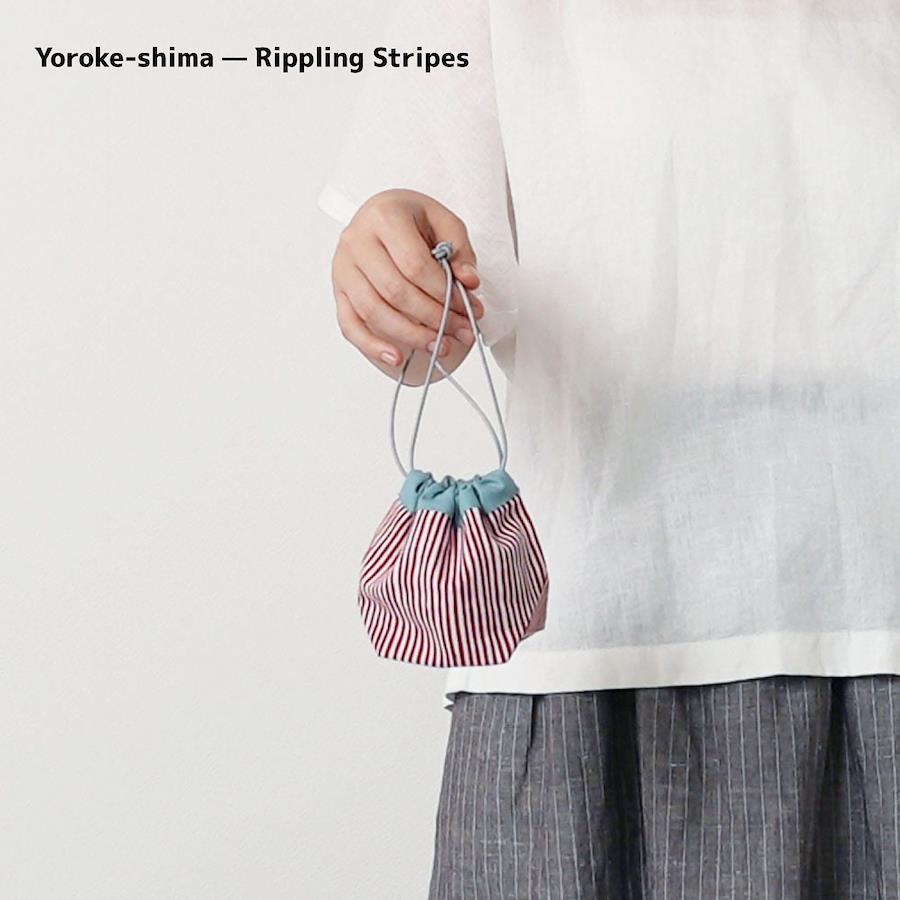 【よろけ縞 】日本の伝統的な縞模様「よろけ縞」を現代風にアレンジした柄。動きのある縞模様がやさしく、どこかあたたかみを感じるデザイン。鮮やかな赤がアクセントになり、持つだけで気分が明るくなる巾着袋です。