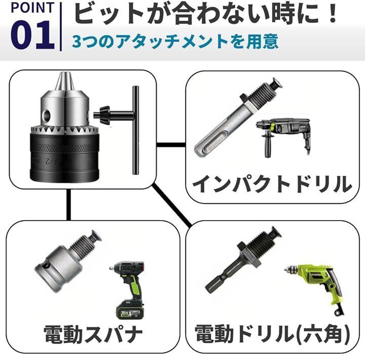 「アダプター付きで多様な電動工具に対応。」電動ドリル・インパクトドライバーなど、さまざまな工具に装着可能なアタッチメントアダプター付き。