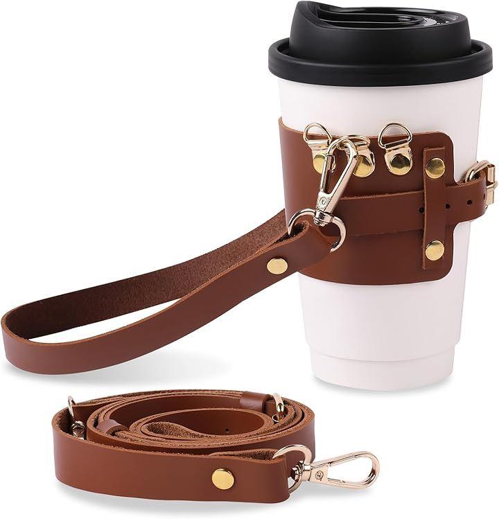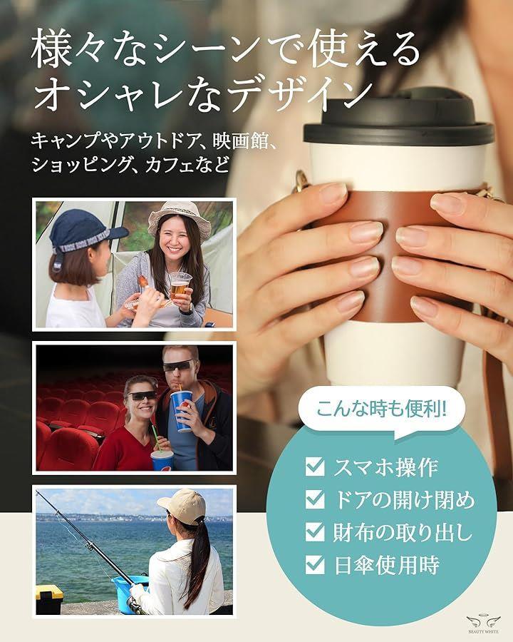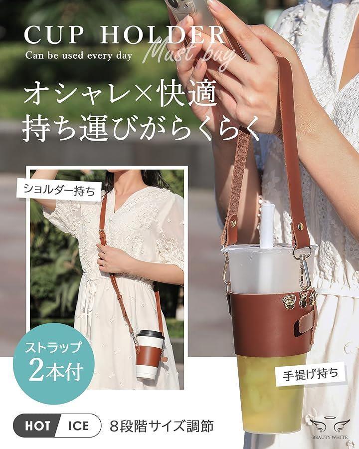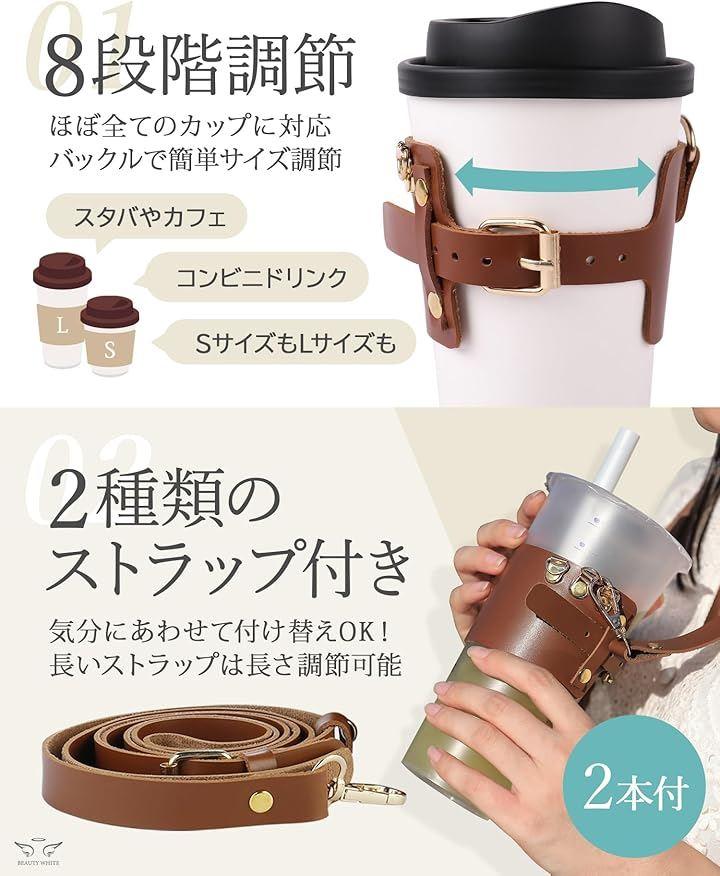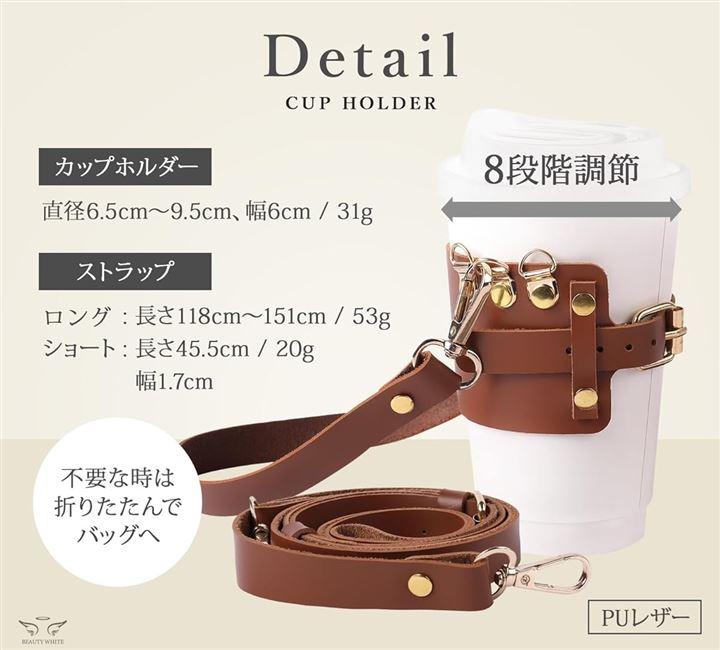 「商品詳細」 〇サイズ:《カップホルダー》飲み口直径6.5cm~9.5cm 調節可能《ロング》長さ118cm~151cm 調節可能、幅1.7cm《ショート》長さ45.5cm、幅1.7cm 〇素材:PUレザー 〇重量:《カップホルダー》31g《長いストラップ》53g《短いストラップ》20g 〇セット内容:カップホルダー、ストラップ(長短2本セット) 〇ブランド:BEAUTY WHITE