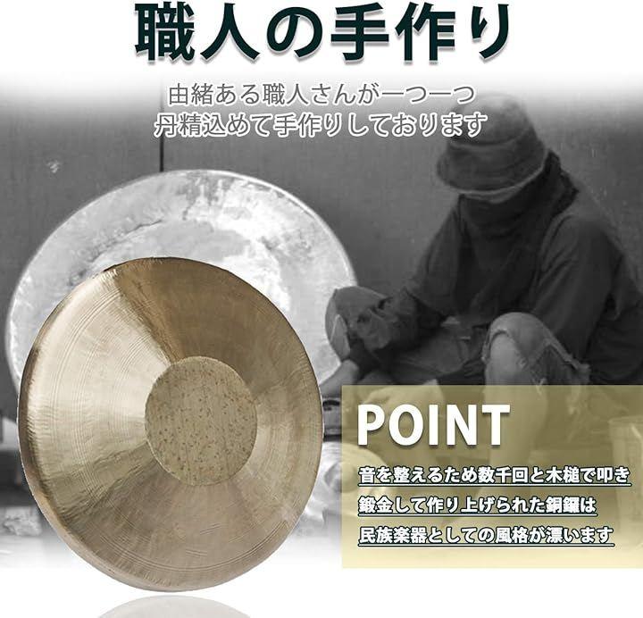 音を整えるため数千回と木槌で叩き鍛金して作り上げられた銅鑼は、民族楽器としての風格が漂います。