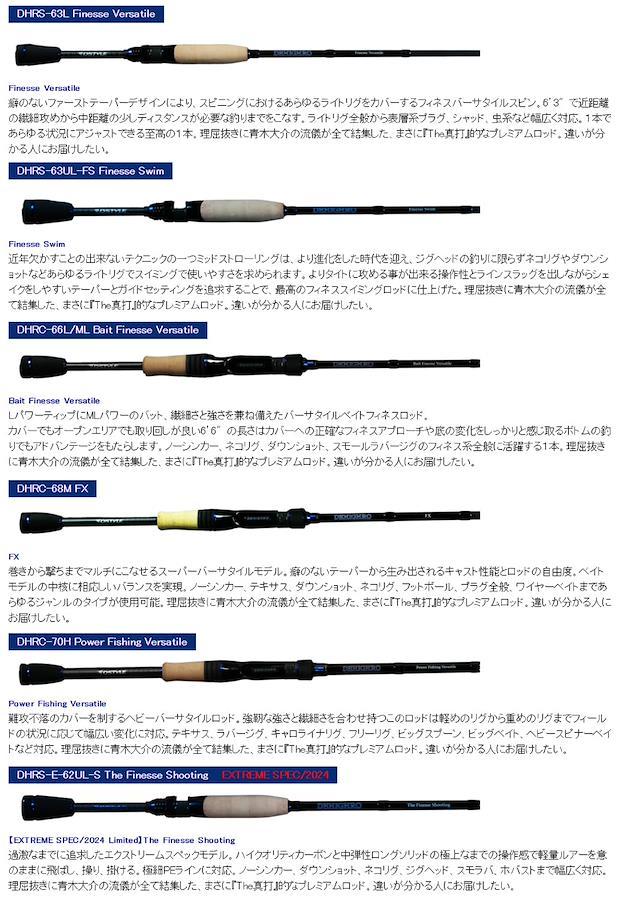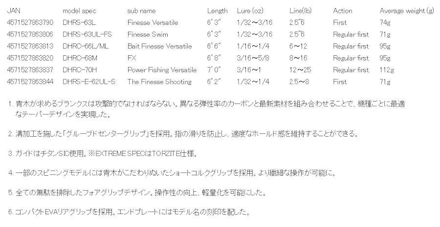 Length: 6'6" / Average weight: 95gSub Name: Bait Finesse VersatileLure(oz): 1/16~1/4 / Line(lb):6~12Action: Regular /ベイトリール対応【DHRC-66L/ML】…LパワーティップにMLパワーのバット、繊細さと強さを兼ね備えたバーサタイルベイトフィネスロッド。取り回しが良い6’6″の長さはカバーへの正確なフィネスアプローチや底の変化をしっかりと感じ取るボトムの釣りでもアドバンテージをもたらします。ノーシンカー、ネコリグ、ダウンショット、スモールラバージグのフィネス系全般に活躍する1本。
