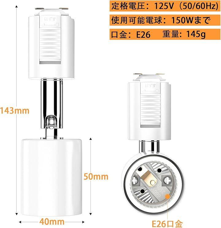 1、本体色:白い,適合負荷:125V 6A 口金:E26,サイズ:約W 40mmxH143mmxD50mm 重量:約143g/個.