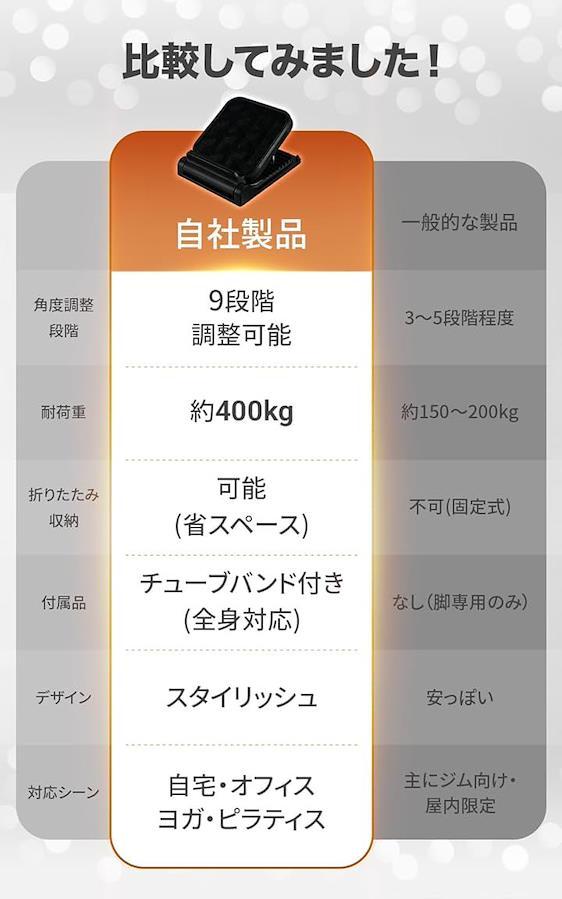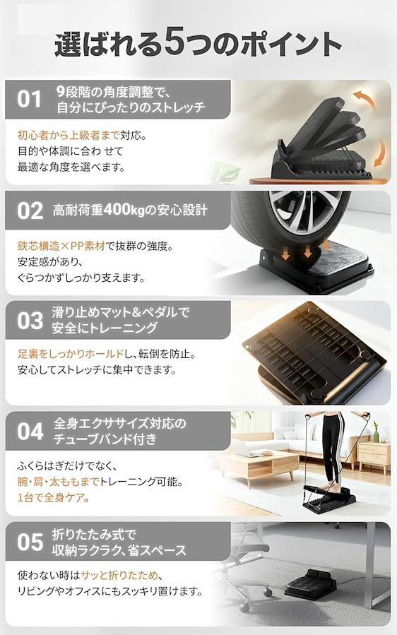 耐荷重400kgの高強度設計と滑り止め付きマットで、安心してふくらはぎ・脚全体をしっかり伸ばせます。