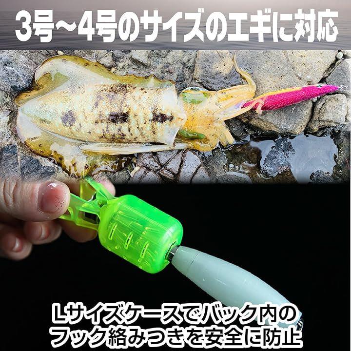 「適用範囲」2.5号~3号サイズのエギに対応するMサイズケース,3号~4号サイズのエギに対応するLサイズケースでバック内のフック絡みつきを安全に防止します。