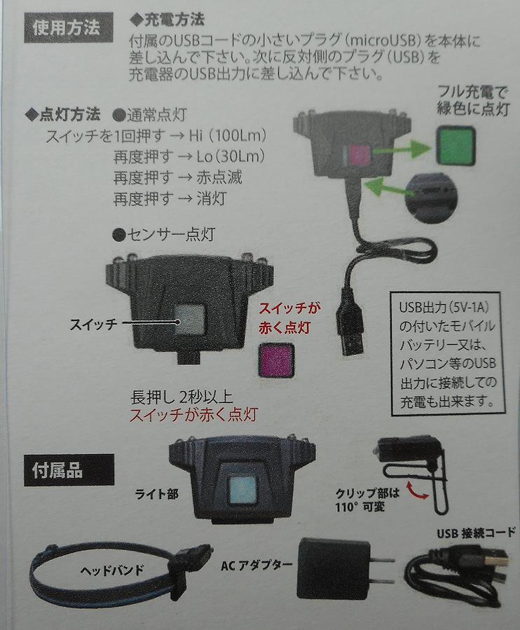 センサーがついたキャップライト。ヘルメットはもちろんのことキャップにも使える。作業現場からアウトドアまで様々なシーンで使うことが出来る。サイズ:約幅70×奥行46×厚さ28mm重量:約48g充電時間:約2時間点灯時間:Hi/約2時間、Low/約4時間、赤点滅/約4時間明るさ:Hi/100ルーメン、Low/30ルーメン内臓電池:リチウムイオン電池付属品:USBケーブル、ヘッドバンド仕様:Low、Hi、赤点滅、消灯