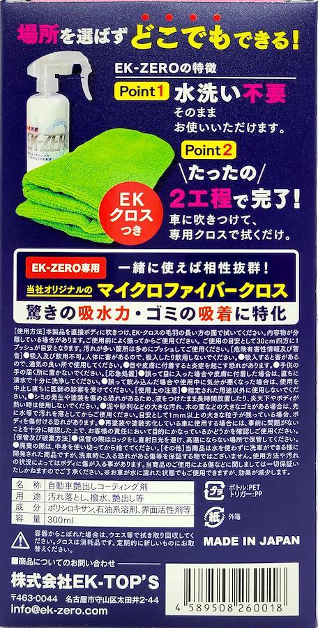 用途: 汚れ落とし、撥水、艶出し等成分: ポリシロキサン、石油系溶剤、界面活性剤セット内容: EK-ZERO300mlマイクロファイバークロス