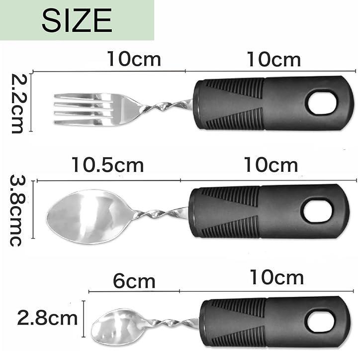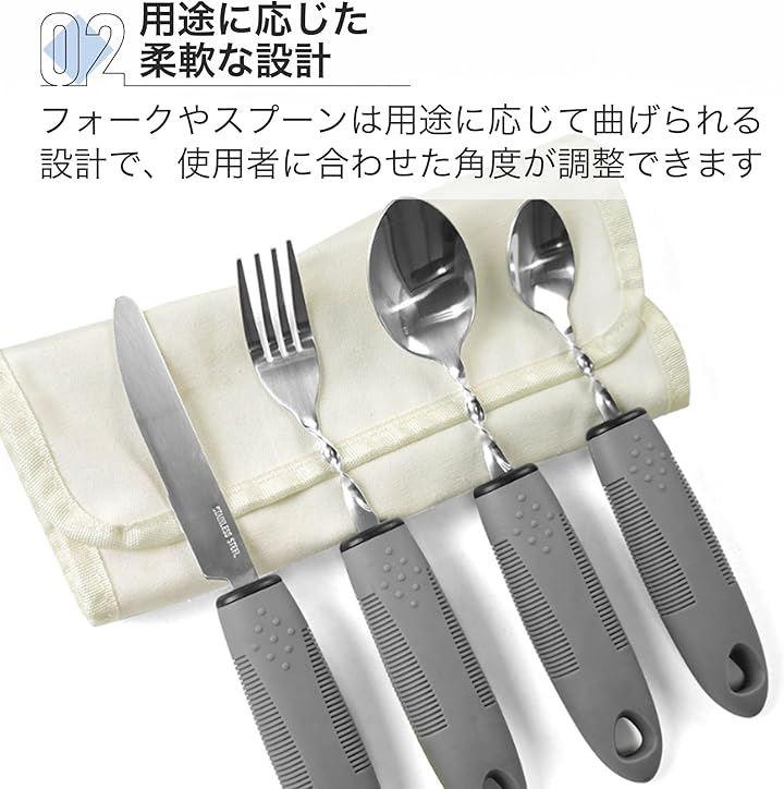 「用途に応じた柔軟な設計」 フォークやスプーンは曲げられる設計で 使用者に合わせた角度が調整できます。