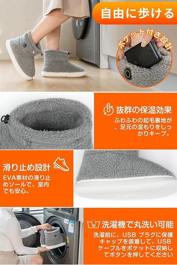 「パッケージ内容・」電気スリッパ本体x1、6000mAhバッテリーx2、充電ケーブル、1.5mの延長コード、日本語取扱説明書x1が含まれます。