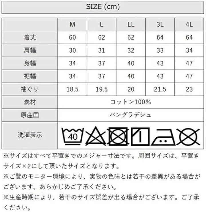 「サイズ」 「Mサイズ 着丈:60cm 肩幅:30cm 身幅:34cm 裾幅:34cm 袖ぐり:18.5cm」 「Lサイズ 着丈:62cm 肩幅:31cm 身幅:37cm 裾幅:37cm 袖ぐり:19.5cm」 「LLサイズ 着丈:62cm 肩幅:32cm 身幅:40cm 裾幅:40cm 袖ぐり:20cm」 「3Lサイズ 着丈:64cm 肩幅:33cm 身幅:43cm 裾幅:43cm 袖ぐり:21.5cm」 「4Lサイズ 着丈:64cm 肩幅:34cm 身幅:47cm 裾幅:47cm 袖ぐり:23cm」 *全部でM、L、LL、3L、4L、充実の5サイズ展開。