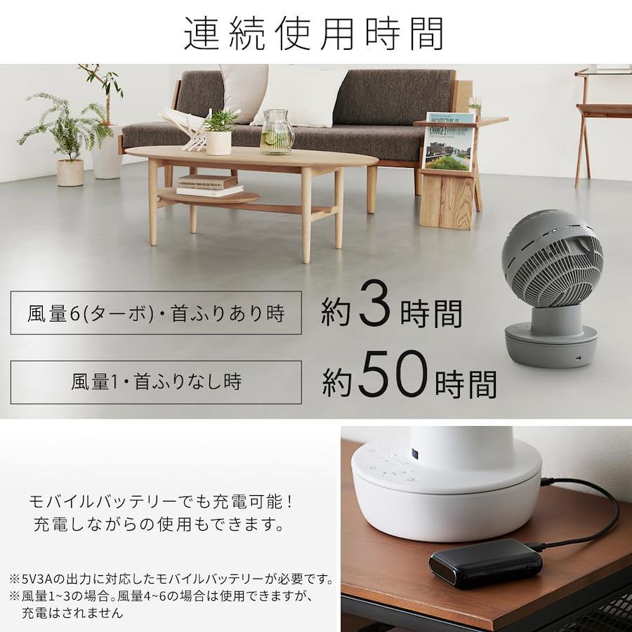 【連続使用時間】風量6(ターボ):約3時間/風量1:約50時間。(※風量6:首ふりあり/風量1:首ふりなしの場合。)モバイルバッテリーでも充電可能!充電しながらの使用もできます。(※5V3Aの出力に対応したモバイルバッテリーが必要です。)