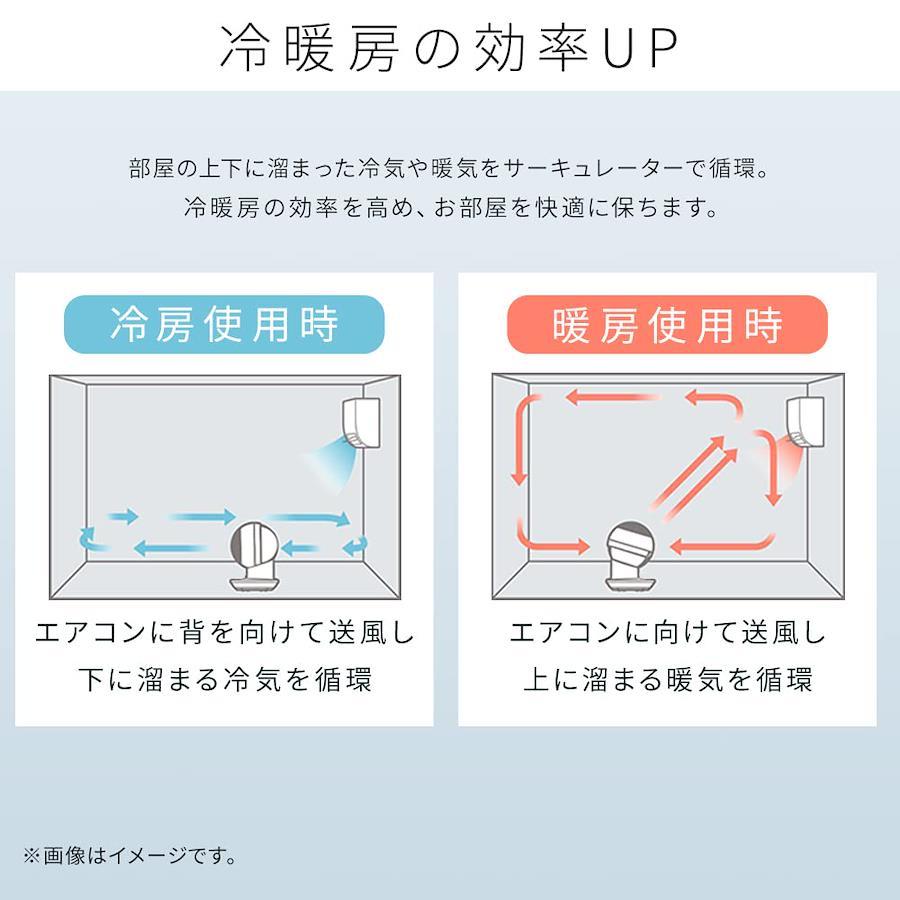 【1年中使える】部屋の上下に溜まった冷気や暖気をサーキュレーターで循環。冷暖房の効率を高め、お部屋を快適に保ちます。・冷房使用時:エアコンに背を向けて送風し、下に溜まる冷気を循環。・暖房使用時:エアコンに向けて送風し、上に溜まる暖気を循環。