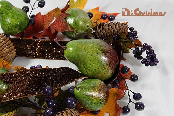 季節の雰囲気を伝える飾りとしてリースは最もポピュラーで扱いやすいグッズのひとつです。このリースはメープルの葉と洋ナシやベリーとリボンをあしらった、オシャレなリースです。ハロウィンの時だけでなく、オータムシーズンずっと飾っていただけます。