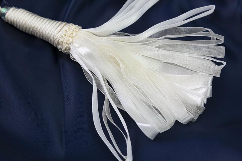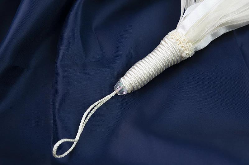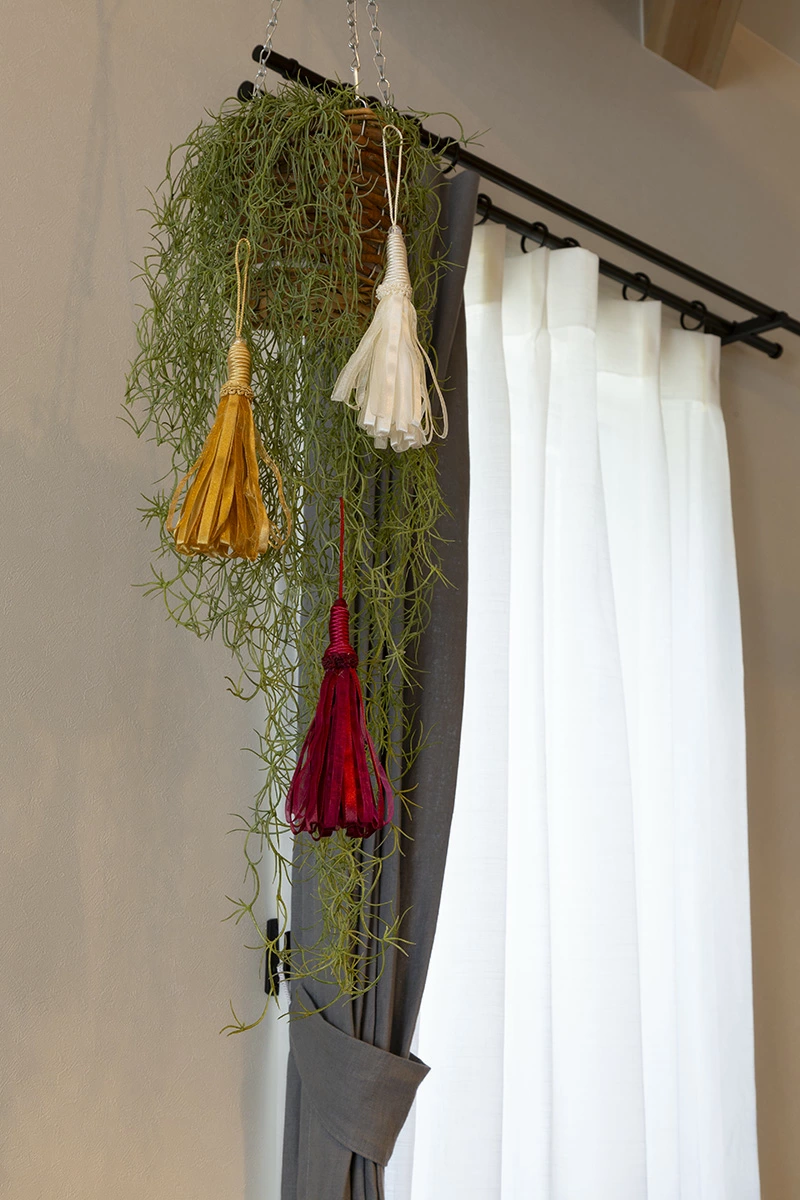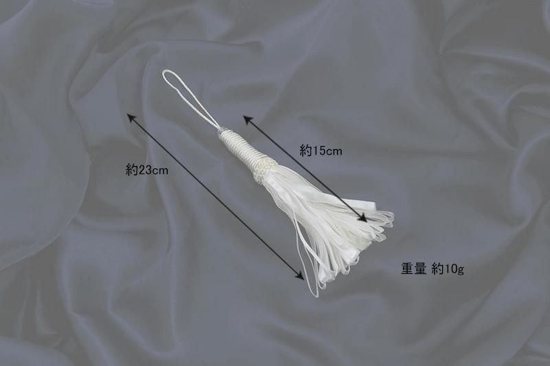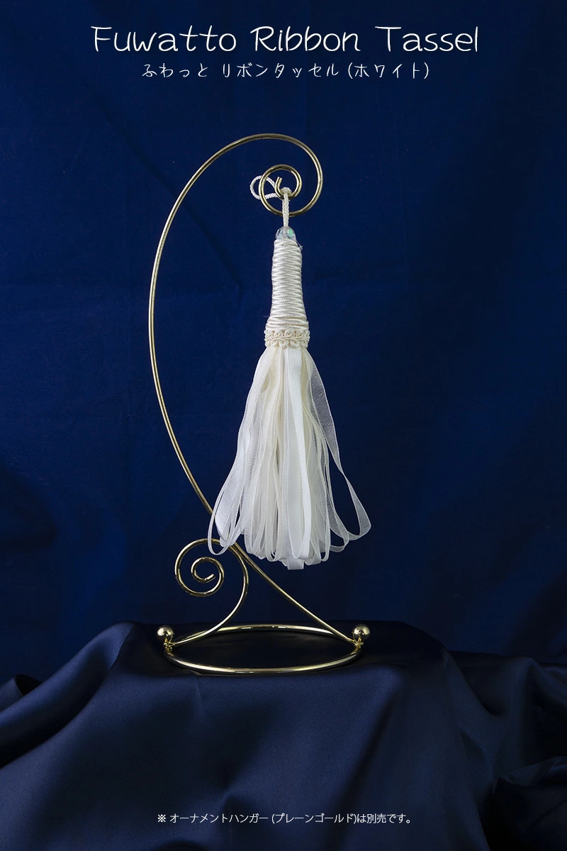 ふわっとリボンタッセル(ホワイト)☆可愛らしくて贅沢な作り主に幅約1cmのリボンで構成されたタッセルです。艶やかな光沢があるリボンと、向こうが透けて見えるオーガンジータイプのリボンの2種類を組み合わせてふんわりリッチな感じに仕上げています。上部のリボンを束ねている部分も上品な光沢がある紐を使い、最上部はビーズの玉でまとめています。可愛らしさと豪華さがうまく融合したタッセルですので、いろんなシーンに良く合います。